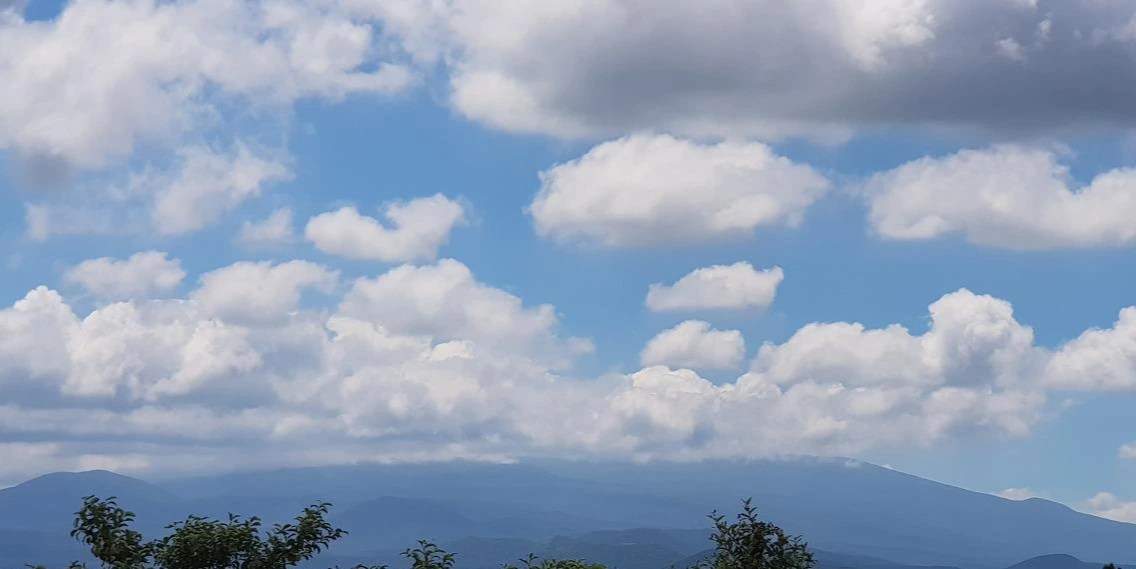 그리 멀지 않은 곳에 한라산이 뭉게구름과 함께 한껏 다른 모습을 선보인다. 오늘도 비가 내리기는 그른 모양이다. 파란 하늘과 흰색 구름이 가득 찬 하늘과 그 하늘을 받들고 서있는 한라산이 정상을 숨기고 있다. 정상 부근에는 비라도 오려는지 약간의 구름이 뭉쳐 있지만 비구름이라 여겨지지는 않는다. 색의 대비가 재미있다. 파란색과 흰색 그리고 초록의 향연이 온 세상을 구분하여 제 갈길을 가고 있다.