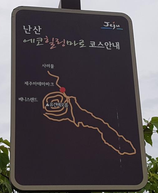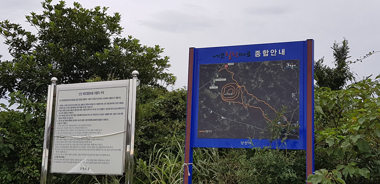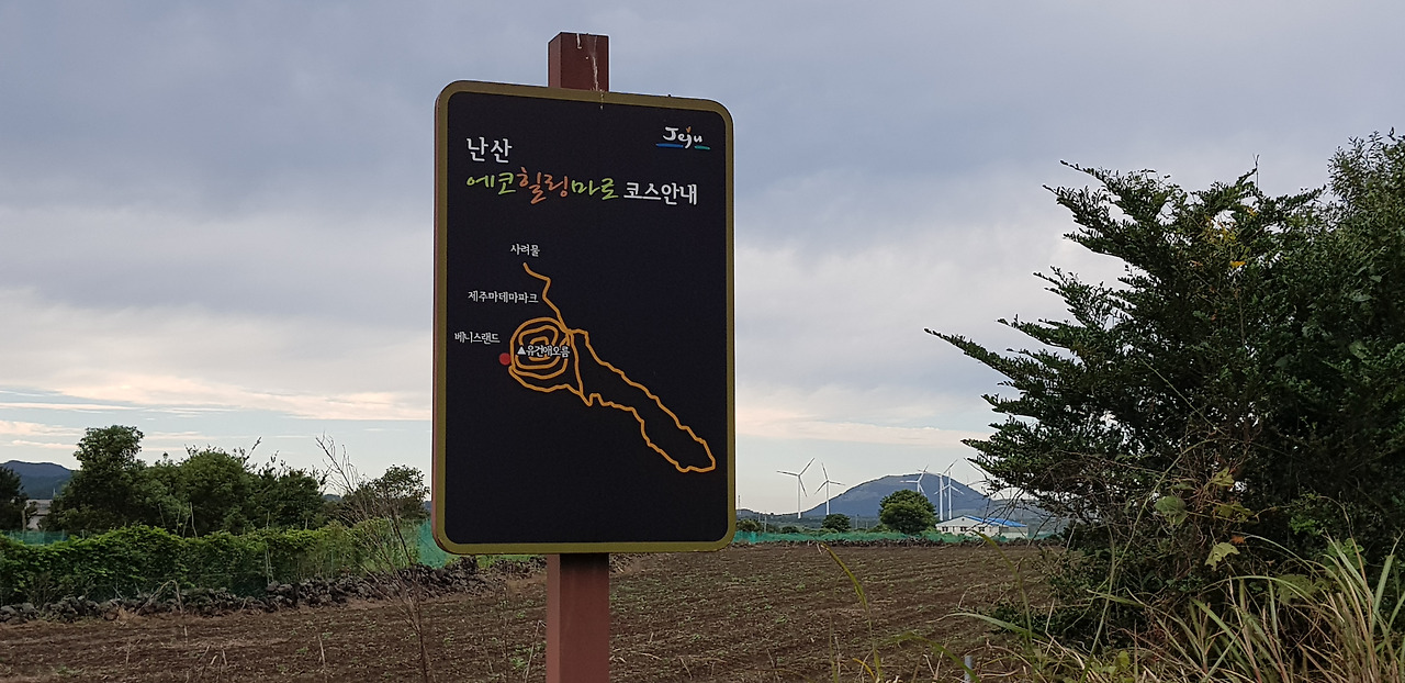 농로로 들어선 길에는 뜻밖의 난산 에코힐링 마로코스라는 안내판이 서있다. 이곳이 오름 입구로서 틀리지는 않은 듯싶은데 여전히 미심쩍다. 들어오는 길에서 조금 멀어진 느낌이다.