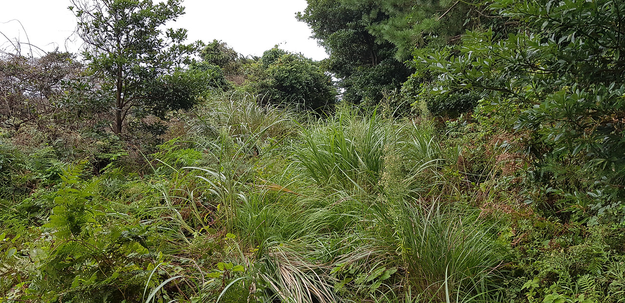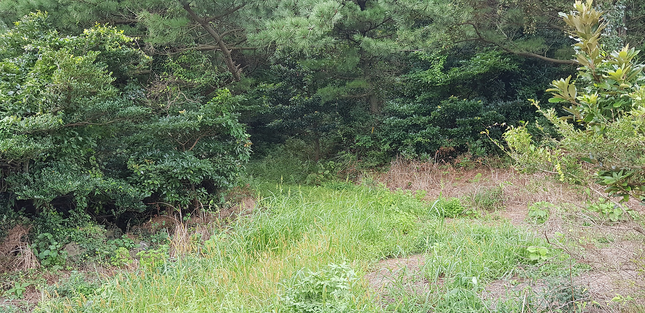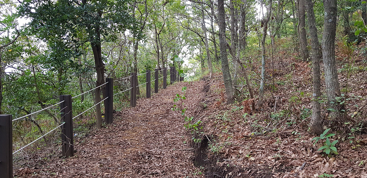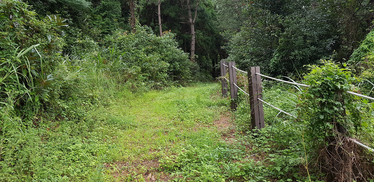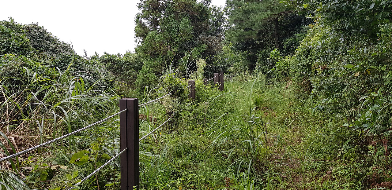 더 이상 오름 주변으로 가까이 갈 수 없다고 느껴지는 곳에 차를 세우니 나름 길의 흔적이 뚜렷하다. 한여름의 열기와 습기를 함께 머금고 있다. 몇발짝을 걸아가본다. 발길 닿는 곳에 야자매트가 깔려있는 것이 확실한데 자라난 풀의 길이가 허리를 넘어선다. 순간 이 길이 맞나 싶다. 그래도 매트를 깔아놨으니 길은 맞겠지 생각하며 길을 나선다. 어느덧 기둥에 줄을 쳐가며 길을 안내한 너른 길이 나온다. 사람들이 잘 다니지 않는 곳인 모양이다.