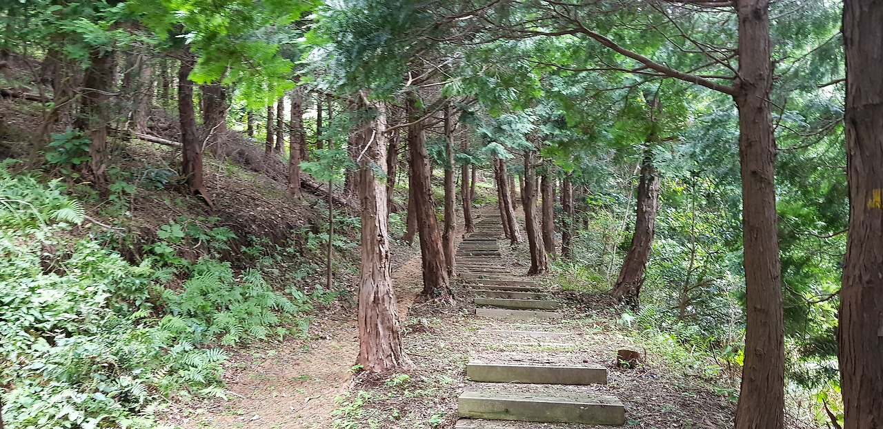 오름 둘레길이 계속되는 곳에 마침내 이정표가 나왔다. 아까와 동일한 표식에 현재의 위치 표시만 다르다. 오름의 정반대 위치에 와있다. 그러고 보니 오름 맨 바깥의 둘레길을 돌아온 셈이다. 앞에 오름으로 오르는 나무계단이 나를 맞는다. 천국으로 가는 계단처럼 멋진 표현이 맞지는 않지만 그래도 정상을 향해 가는 길목이라 생각하면서 기쁜 마음으로 발길을 옮긴다. 오르는 도중 양 옆으로 또 다른 길이 갈라진다. 이곳은 오름 중간을 도는 둘레길이지 싶다.