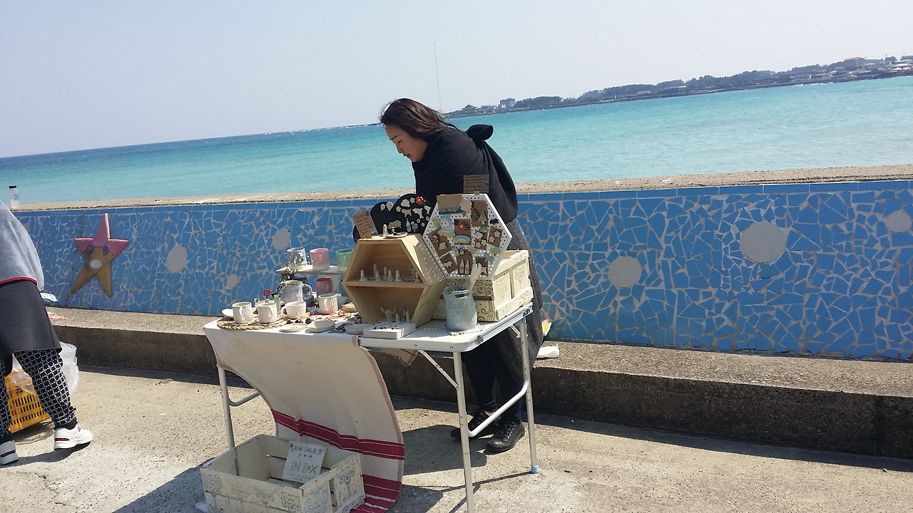 바닷가는 이미 장사진을 친 채 많은 사람들을 받아들이고 있었다. 파란 바다가 더욱 빛을 발하는 날 자그마한 테이블에 자신만의 정성과 영혼을 담았을 물건들이 아기자기하게 널려있다. 세화 바다가 유독 더 파랗게 보인다.