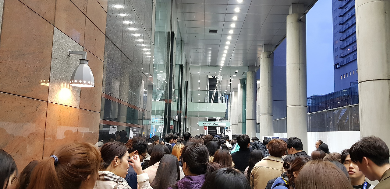 일본스러운 안내원들이 서서 들어오는 모든 이들에게 줄을 서게 하고 있다. 엘리베이터를 타기 전에 6줄로 서달라는 종이 팻말을 들고 사람들에게 줄을 설 것을 요청하고 있다. 그 첫 줄은 한국말이다. 사람들의 대다수는 한국인으로 보인다. 몇%쯤 될까? 그래서인가 안내표시판은 한국어 말고 영어로 쓰여 있다. 이후로 엘리베이터를 타기까지 30분은 족히 서서 기다린 느낌이다. 매사가 삐딱한 나로서도 줄을 설 수밖에 없지 않은가.