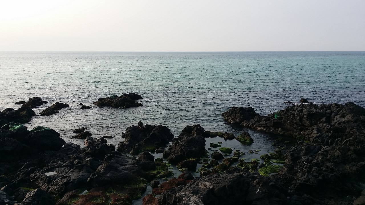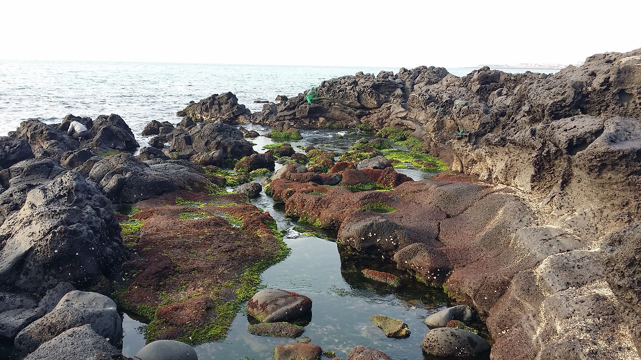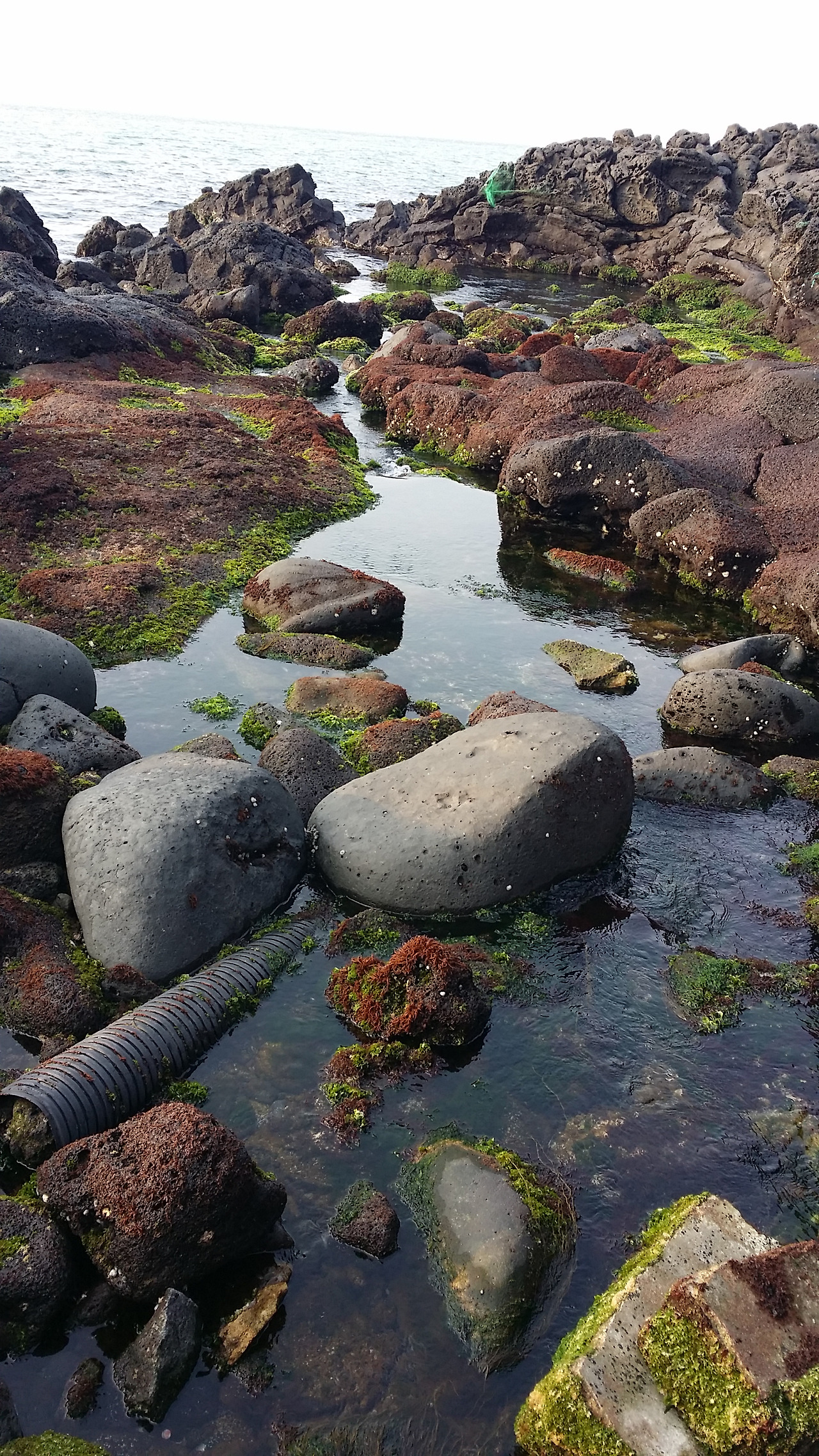 녀석에게 내몰려 살며시 용천수가 터져나오는 바닷가를 찾았다. 용천수와 바닷물이 만나는 자리라 그런가 해초가 낀 바위가 가득이다. 해초의 색과 모양이 광치기 해변을 생각나게 한다. 바위에 낀 초록색 해초는 언제 보아도 다분히 그로테스크하다.