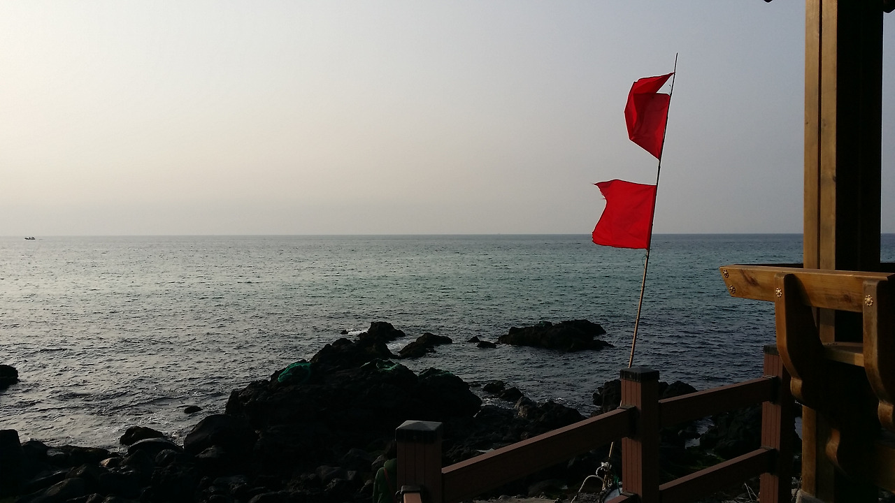 바다가 조금씩 해를 부르는 시간. 마지막 용틀임을 위해 상기된 얼굴을 보이기 시작한다. 그 바람에 어디선가 누워있던 깃발이 펄럭인다. 마치 성황당 깃발 모양 무언가를 부르는 느낌이다. 특정한 누구를 부르지 않아도 바다 어디선가 저 붉은색 깃발을 보면 물길을 헤치고 고개를 비쭉 내밀듯한 기세다.