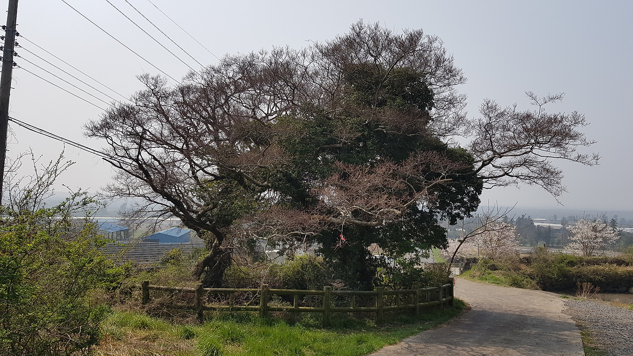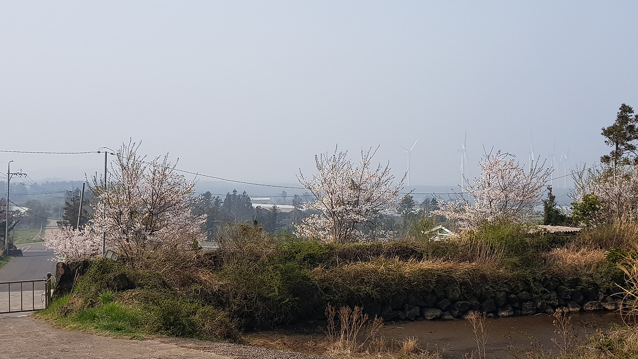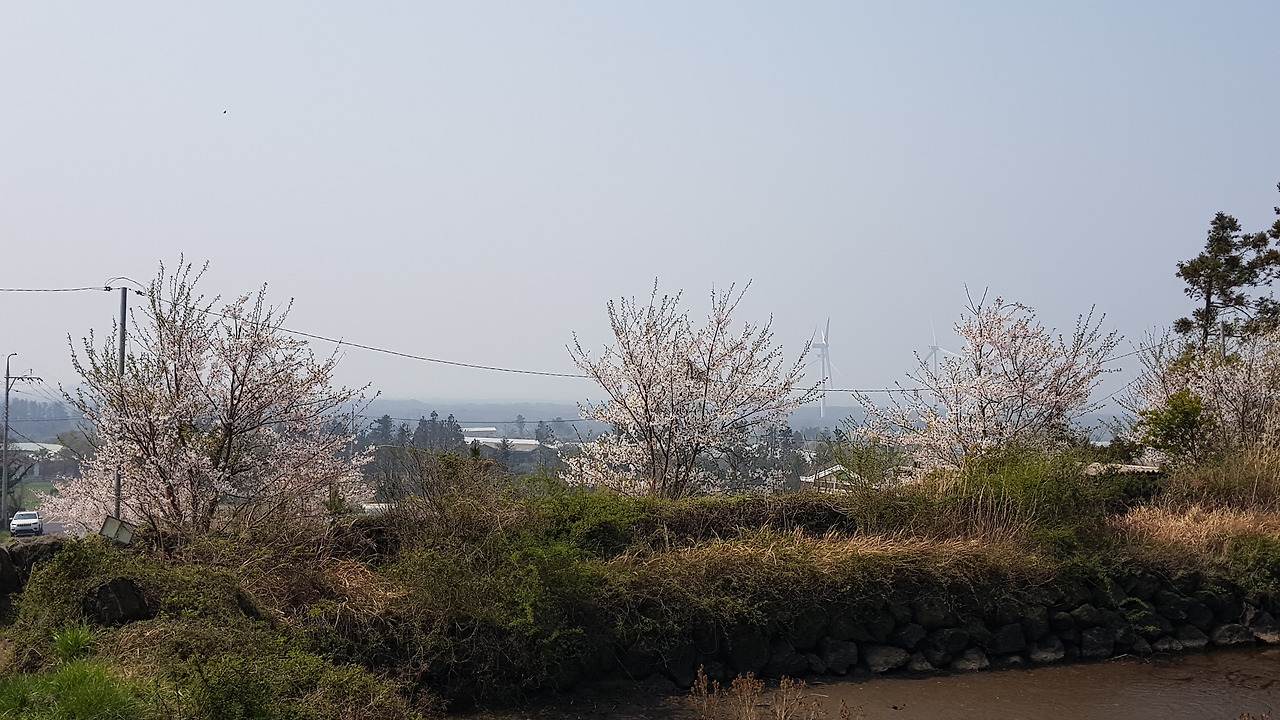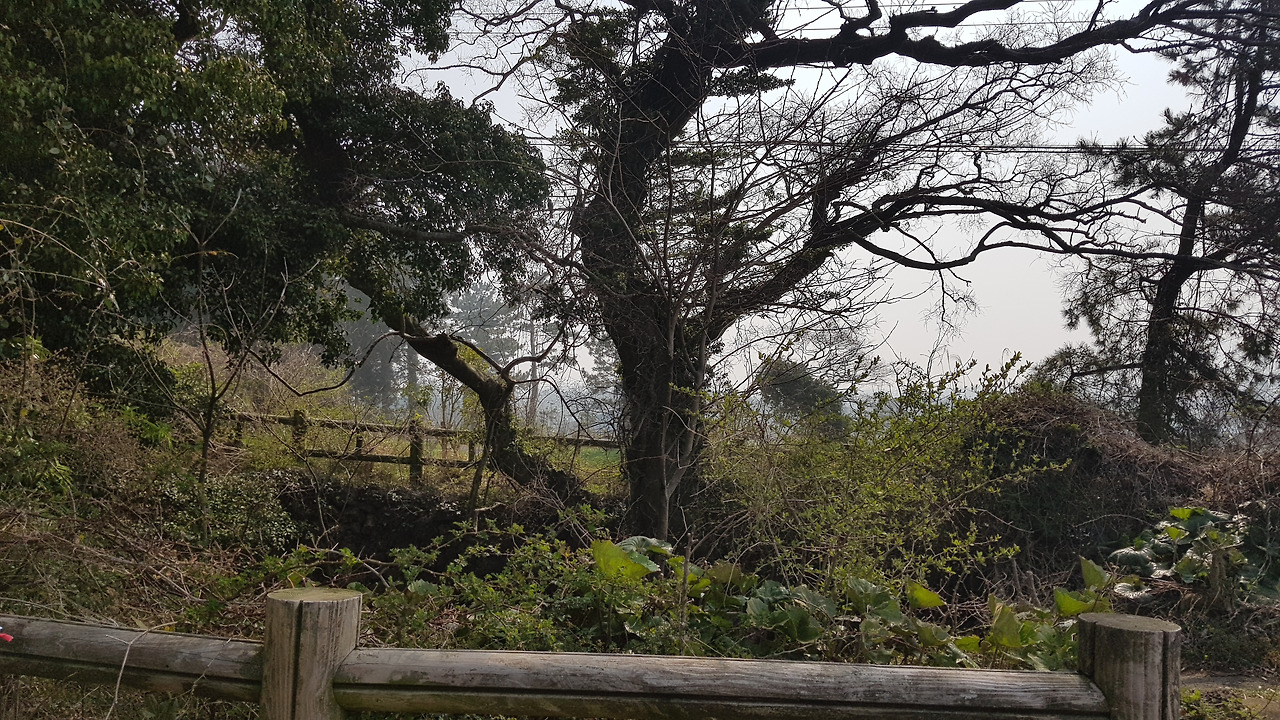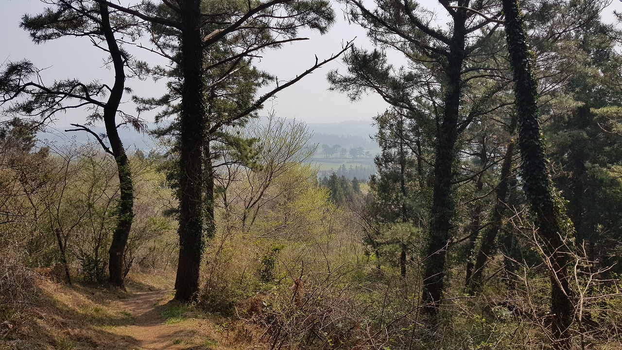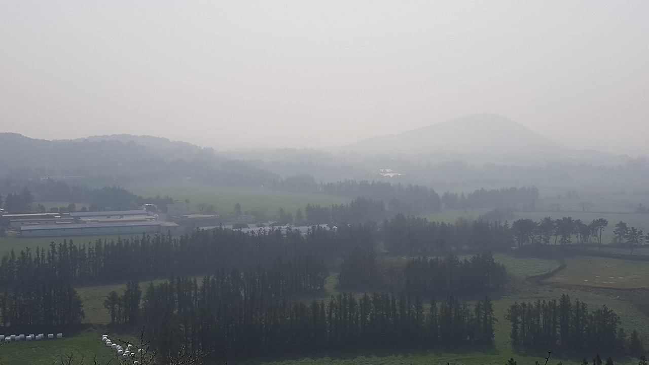 미세먼지 때문인가 주변의 풍경이 불투명한 공기 속에서 아스라하다. 나름 멋진 모습이기는 하지만 이 모습은 새벽의 안개로 인한 것이어야지 미세먼지로 인해서야 영 개운치 않다. 아스라한 오름과 그 앞에 심어진 삼나무 숲들이 첩첩히 가려지는 게 묘한 농촌의 풍광을 자아낸다. 마치 남도의 어느 농촌마을을 바라보는 느낌이랄까. 갑자기 지리산 노고단 언저리에서 아래의 농촌 지역을 바라보던 기억이 떠오른다. 육지에 가보고픈 모양이다.