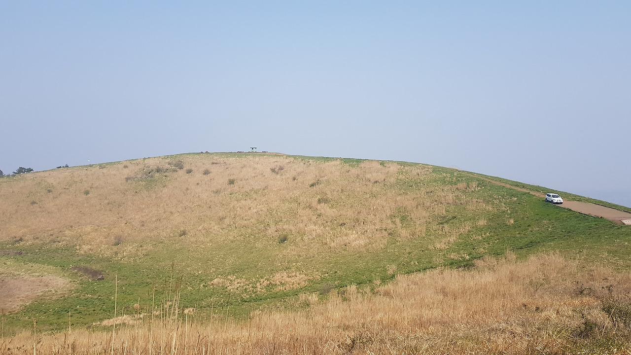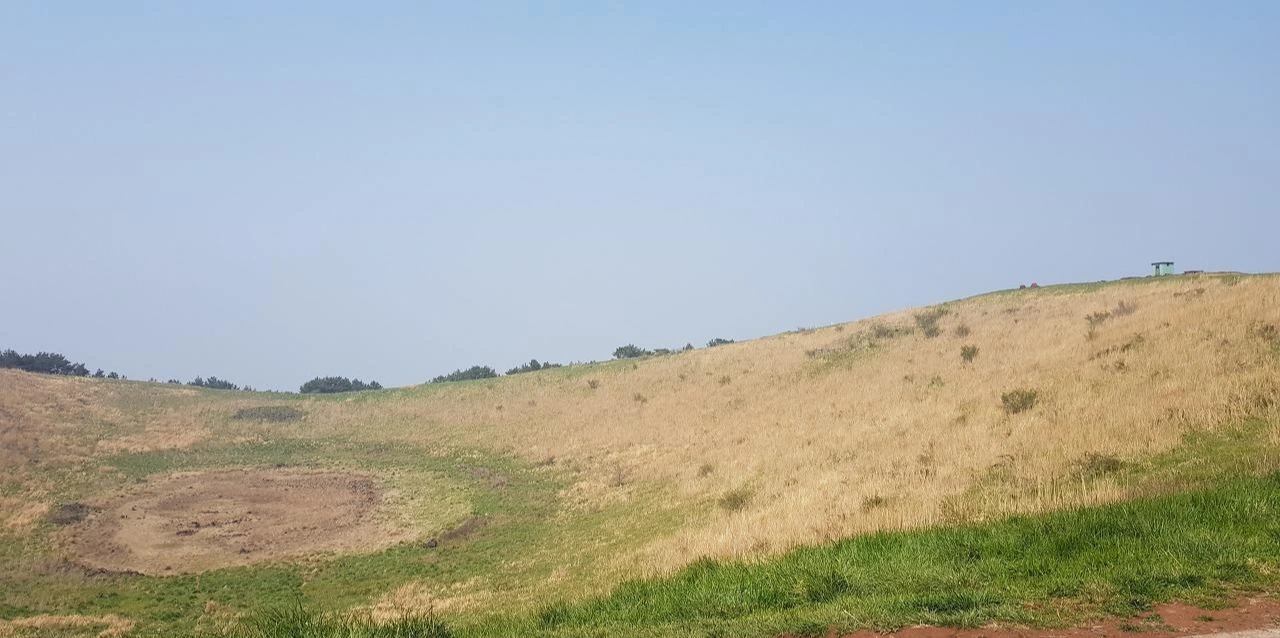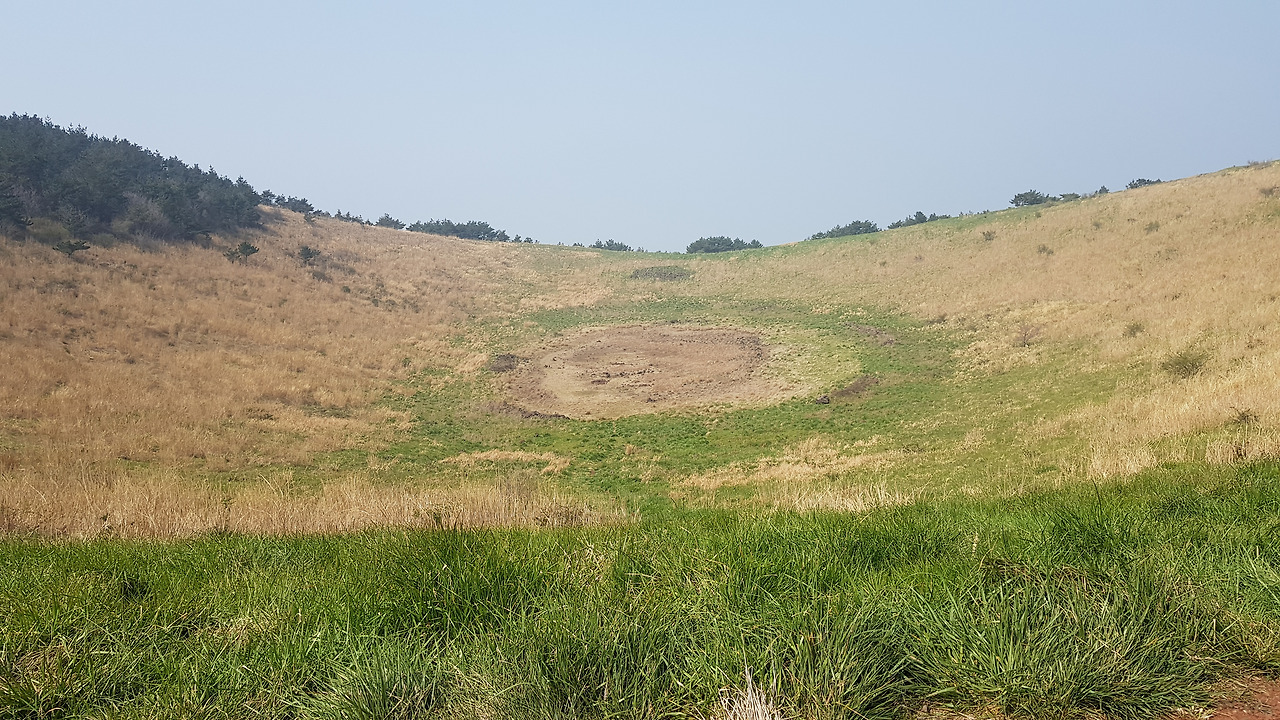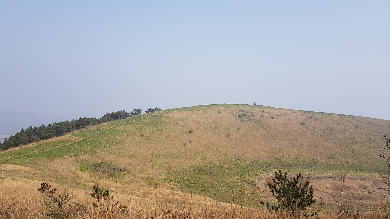 정상에 오르니 능선이 한눈에 보인다. 능선의 곡선이 꽤나 이쁜 오름이다. 다랑쉬나 용눈이처럼 한눈에 능선이 보이고 탁 트인 느낌을 주는 것이 역시 이름 있는 오름 값을 한다. 가운데 물 웅덩이가 있었을 텐데 가뭄이 심하다 보니 흔적만 남아있다. 아직은 초록의 풀들이 자라지 않은 상태인가 억새의 느낌이 강하다. 웅덩이의 흔적은 마치 헬리곱터 착륙장이라도 되는 듯 원을 그려넣고 있다.