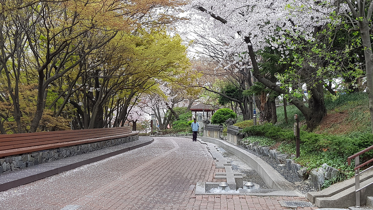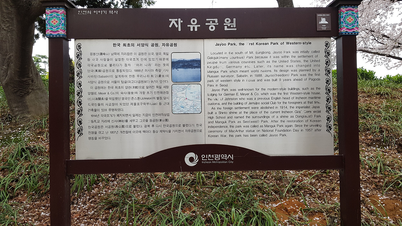 그 건물을 지나 위로 식식거리며 오르니 자유공원이다. 공원 한복판에 9.15 인천 상륙작전의 사령관이었던 맥아더 장군의 동상이 보인다. 아는 사람들은 알겠지만 그 동상이 원래 이곳에 있던 것은 아니다. 공원 옆의 다른 공원에 있었는데 고등학교 시절인가 언젠가 지금의 장소로 이전했다. 오래된 공원의 풍취가 이곳저곳에 남아있다. 남아있는 벚꽃이 반가워 여기저기서 삼삼오오 모여 사진을 찍거나 즐거워하는 모습이다. 자유공원은 어찌 됐든 한국 최초의 서양식 공원이다. 전쟁 후 그동안의 다양한 이름에서 자유공원이라는 이름이 정착됐다.