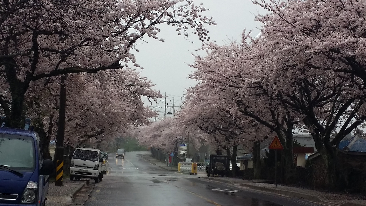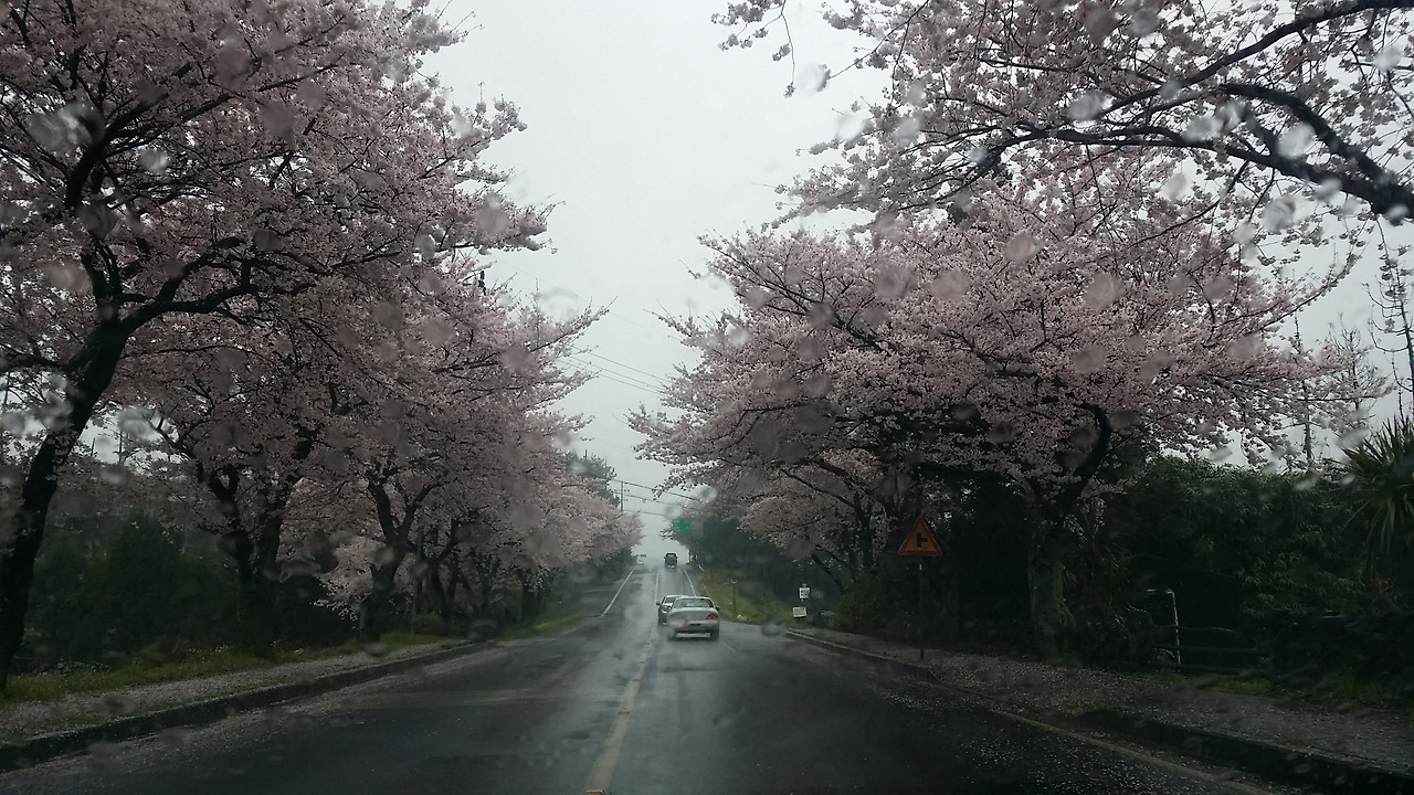목적지에 도착하기도 전에 가는 길은 충분히 벚꽃의 아름다움과 운치를 뽐낸다. 정작 메인이벤트는 어쩌려고 사전예고부터 이리 심상치 않을까 싶다. 가기 전 여러 번 차를 멈춰야 했다. 비가 벚꽃과 잘 어울린다는 생각이 든다. 다행히 바람이 거의 없는 날이다.