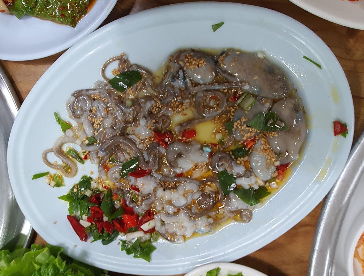 일단 큰 부담 없이 동네가 해남이니만큼 음식은 어딜 가나 기본 이상일 것이라는 안도감을 갖고 앉는다. 주인장 아주머니가 세발낙지가 있는데 먹겠냐며 묻는다. 낙지가 다 팔리고 5마리 남았단다. 한 마리당 4천 원. 그럼 한 접시에 2만 원인 셈이다. 실제로 담아온 한 접시가 생각보다 훨씬 양이 많다. 이것만으로도 득템이다. 옛적에 아마 10년도 더 넘었을 텐데. 시기도 모르고 여름휴가철에 남도에 내려와서는 세발낙지가 유명하다고 무안에 갔다가 구경도 못하고 매운탕을 먹었던 기억이 난다. 가격도 비싸고 만족도가 낮아 꽤나 아쉬웠던 기억이 새롭게 떠오른다.