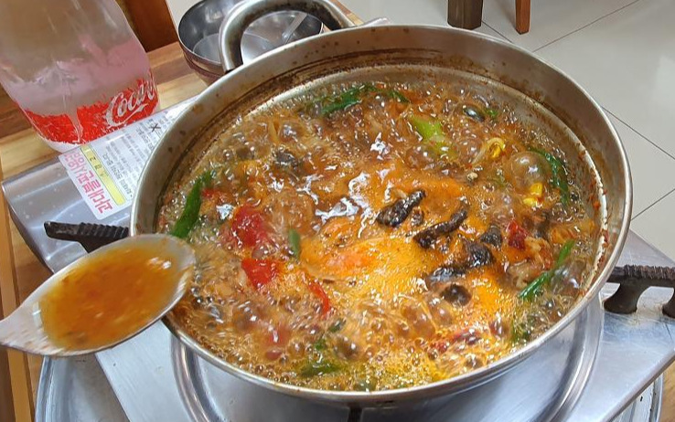 가게에 들어가니 식사하는 한두 팀을 제외하고 공간이 휑하니 비어 보인다. 안쪽에 들어가 앉았다. 빈터에 그냥 들어가 앉아있으려니 낯설고 생소하다. 다행히 가격이 좋다. 1인당 1만 원. 곧이어 직원 두 분이 상을 양쪽으로 들고 들어와 가운데 놓고 간다. 다른 반찬들이야 그렇다 치고 해물탕에 돼지불고기, 조기류, 아마도 부세 쯤 되겠지만 그리고 이거 저거. 반찬 가짓수로만 따지면 접시만 18개다. 사실 이것 만으로도 만족 아닌가. 아무리 음식의 맛을 고려치 않아도 이 다양한 반찬에 생선과 육류는 기본의 맛이고 나머지는 지역의 야채들인데 뭐가 걱정이랴. 해물탕은 생각보다 내용이 튼실하다. 조개에 게는 물론 홍합 그리고 전복도 있다. 이거 한 뚝배기만 해도 가격을 논할 바 아니다.