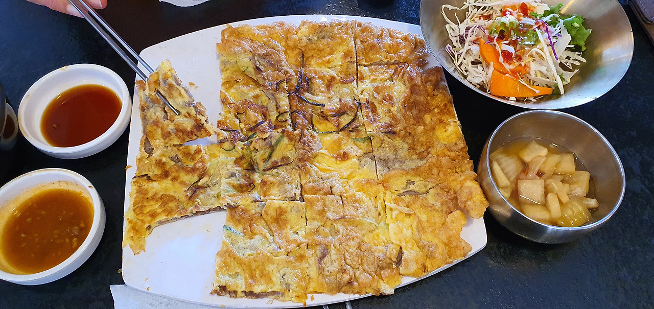 일단 냉면은 이북식 냉면이 아닌 관계로 비교적 맛이 심심하기보다는 조금 자극적이라는 생각이 미쳤다. 냉면은 맛이 있었다는 말밖에 할 수 없다. 냉면은 오묘한 맛을 평가하기에는 사실 다른 냉면과의 차이를 명확히 집어내야 하는데 그러기에는 내 입맛이 그렇게 전문적이지 않기에 단순한 비교 외에는 할 수가 없었다. 당연히 평양냉면에 비하면 자극적일 수박에 없다. 그러나 흔히 서울에서 먹게 되는 오장동 냉면이나 이런 곳에 비하면 달달함이나 매콤함이 조금은 작다. 허기 때문만은 아니겠지만 헐레벌떡 물냉면과 비빔냉면을 번갈아 가면서 먹어가는데 양이 장난이 아닐 만큼 많다는 사실에 놀랍다. 남녀가 함께 다 먹기에는 벅찬 양이다. 특히 집사람이 먹는 양을 고려하면. 그리고 우리에게는 2만 4천 원짜리 육전이 기다리고 있다.