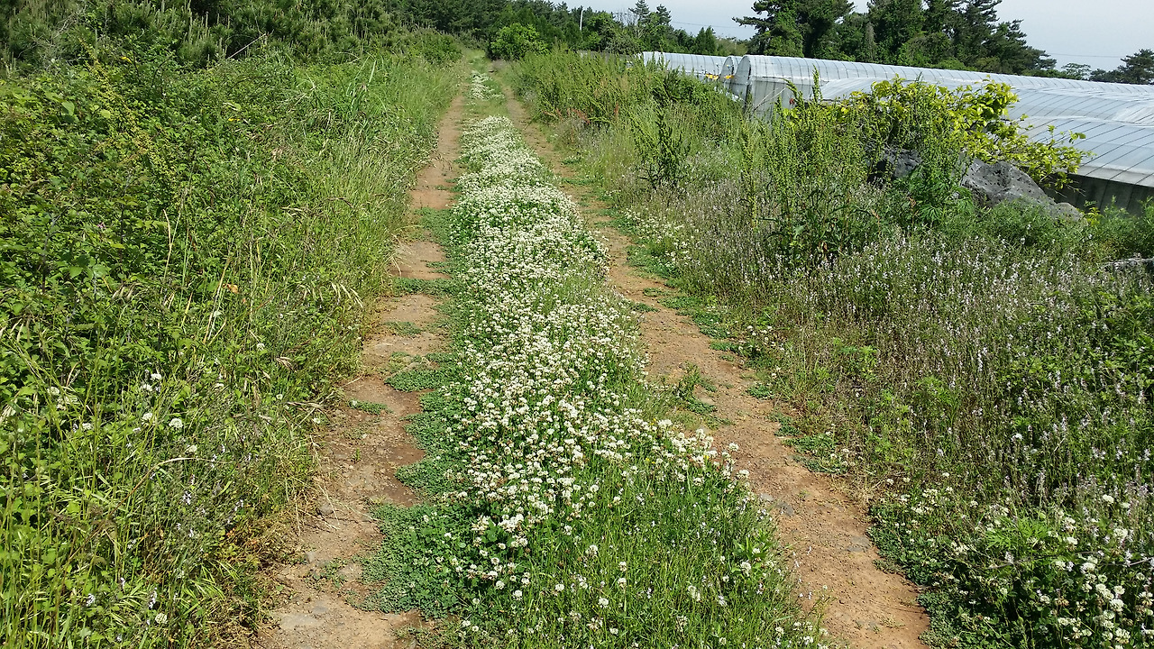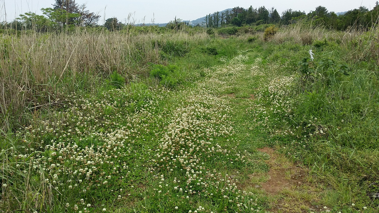 올레길은 처음부터 샛길로 빠져가며 저지오름 오른쪽 길을 향해 간다. 마을길과 과수원을 지나면서 오붓한 느낌이다. 지난번처럼 날씨가 우중충하지도 않고 아주 뙤약볕도 아닌 덕에 걷는 느낌이 상쾌함을 준다. 구불구불 마을길 이곳저곳을 지나다 보니 토끼풀이 쫙 깔린 길도 나오고 이름 모를 노란색, 아마도 애기똥풀 같은 느낌의 꽃 길이 나오기도 한다. 호젓하다. 천천히 걷는 기분이 맘에 든다.