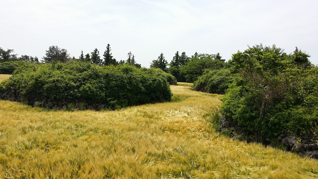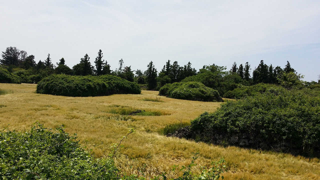 재미있는 풍경을 만났다. 보리밭 사이사이로 바위나 흙덩어리 같은 것들이 띄엄띄엄하게 놓여있다. 자세히 보니 바람에 흔들리는 보리밭 사이를 이 바위들이 사사삭 소리를 내면서 움직이는 모습이다. 한두 개의 바위 덩어리가 아니라 10개는 족히 넘을 바위들이 위에는 온갖 풀과 잡목들을 뒤집어쓴 채 조그막하게 얹어져 있다. 보리밭을 수영한다. 갑자기 다도해에 섬들이 점점이 흩어져 있는 착각을
