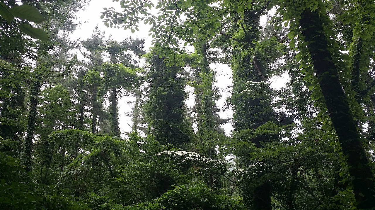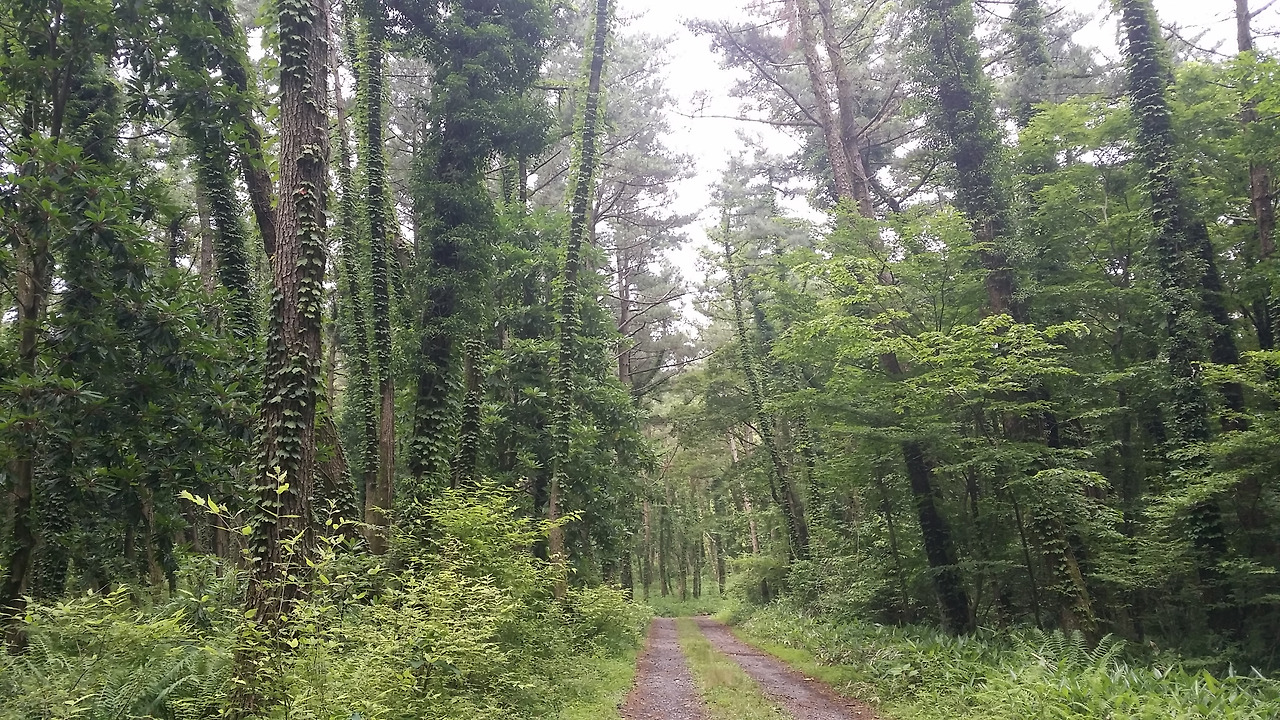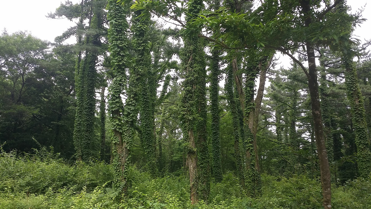 먼저 다녀온 사람의 설명에 의하면 좌회전 후 8km 가까이라고 한다. 그게 사실이라면 꽤나 깊은 산속이다. 임도를 따라 한참을 들어갔다. 중간에 나오는 트럭과 RV 자동차 각각 한대를 만난 이후 아직 인기척은 없다. 숲은 점점 더 사람의 흔적과는 거리가 먼 듯 원시적인 느낌의 깊은 분위기를 만들어낸다. 하늘로 높이 뻗은 나무와 그 나무들을 칭칭 감고는 육지에서는 볼 수 없는 분위기를 만들어대 넝쿨 숲의 분위기. 공교롭게도 어느 순간에 이르자 다양해 보이던 나무 밑의 식생은 조릿대의 비율이 점점 커지고 있었다.