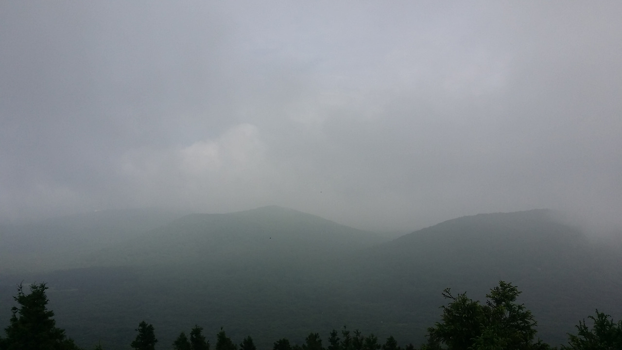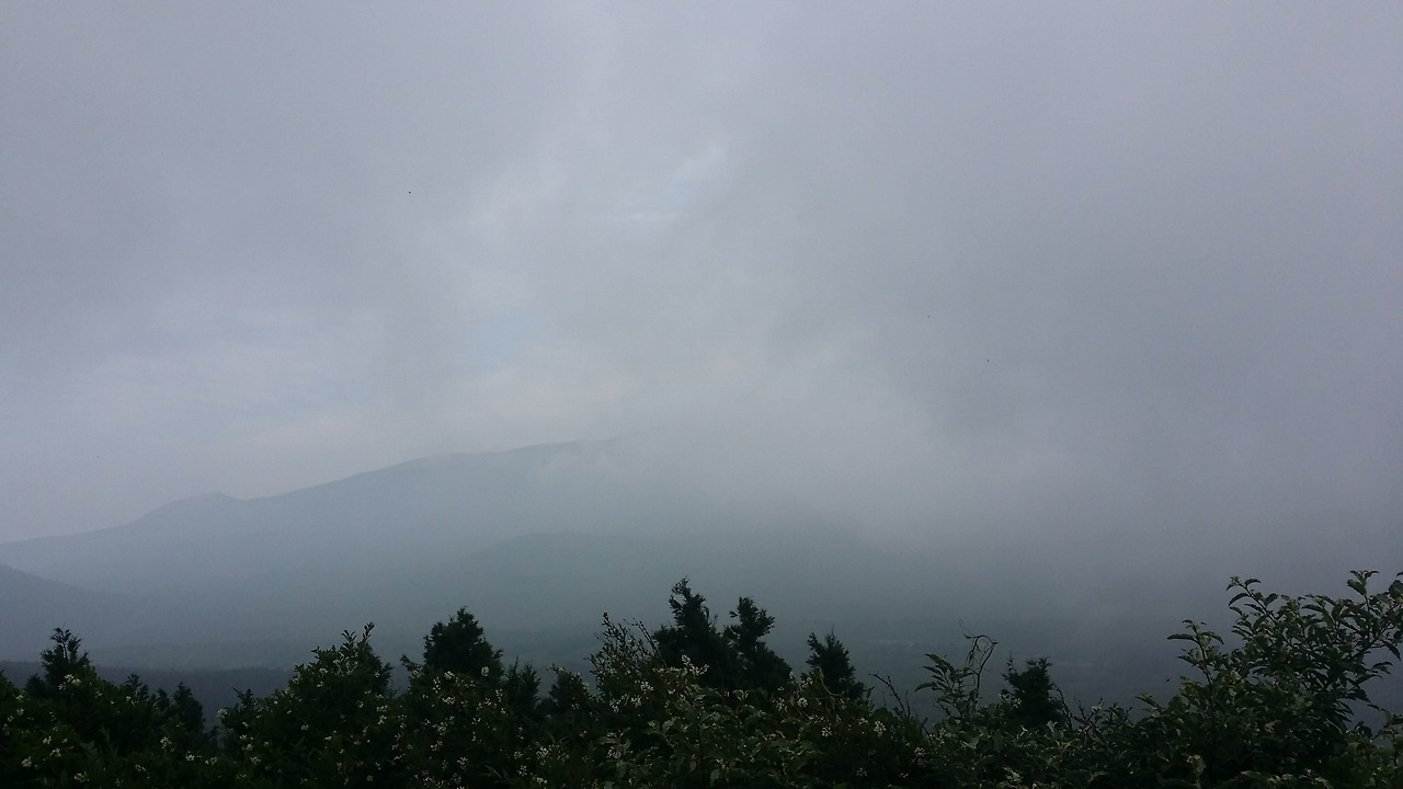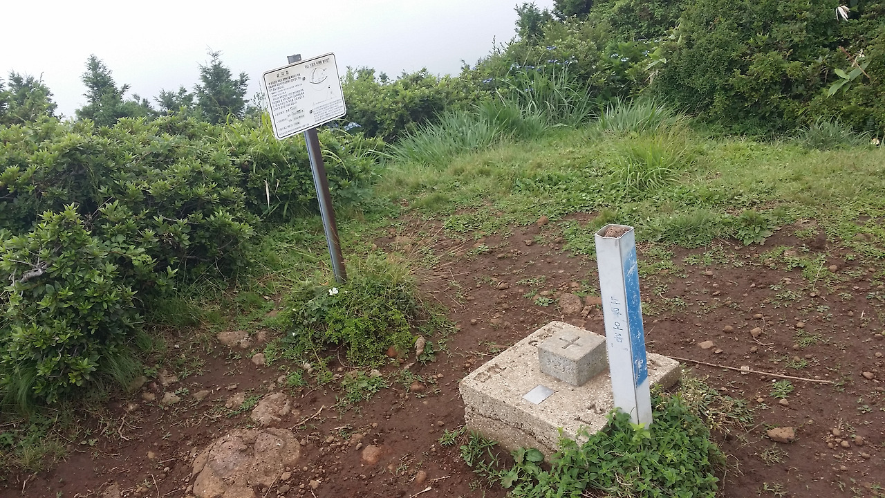 익히 알고 있었지만 주변은 안개로 가득 차 있어 아무런 경치도 감상할 수 없다. 처음에는 방향조차 가늠하기 힘들더니 내려가려고 하는 사이 조금 안개가 걷히는가 싶다. 다시 정상에 올라 한라산 방향 쪽을 바라본다. 멀리 봉우리가 세 개 희미하게 보이고 맨 뒤편의 조금 높은 봉우리에 군 기지를 표시하는 철탑 같은 구조물이 보이는 듯하다.