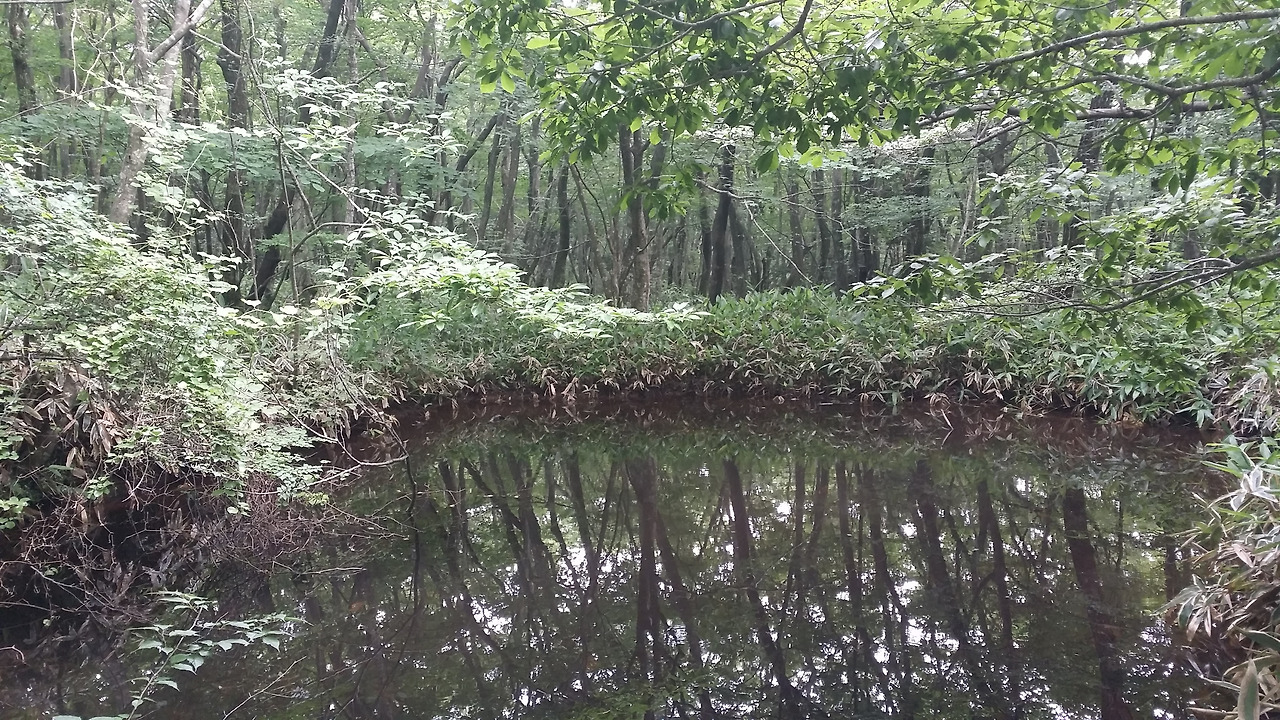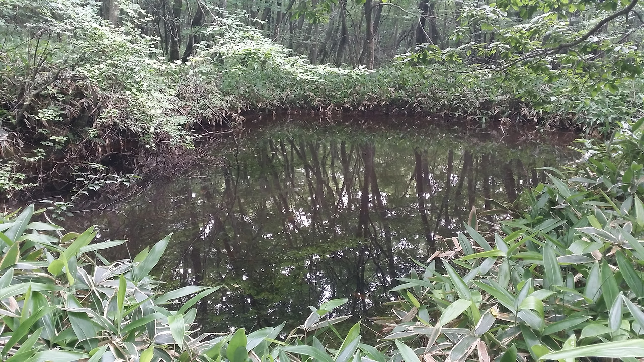 얼마를 걸었는지도 모르겠다. 이윽고 약간의 색다른 풍경이 보인다. 전혀 예상치 못한 연못이 있다. 이 연못이 왜 이리 반가울까. 조릿대와 제멋대로의 나무 이외에는 아무런 차이도 구분점도 없는 상황에서 덜렁 연못이 있으니 그 연못이 대단한 의미를 가지지 않았나 싶다.