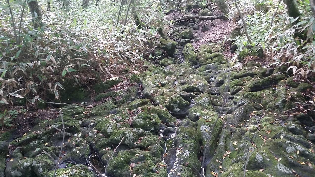 연못을 지나자 비가 오면 물길이 이어진 개울의 흔적이 낮은 지형을 따라 형성되어 있음을 보인다. 평상시에는 물이 있을 턱이 없으니 바위에 맺힌 이끼만이 가득한 채 울퉁불퉁한 모습만 보인다. 그것만으로도 반갑다. 조릿대 이외의 모든 모습과 현상은 현재로서는 놀라운 예외일 뿐이다.