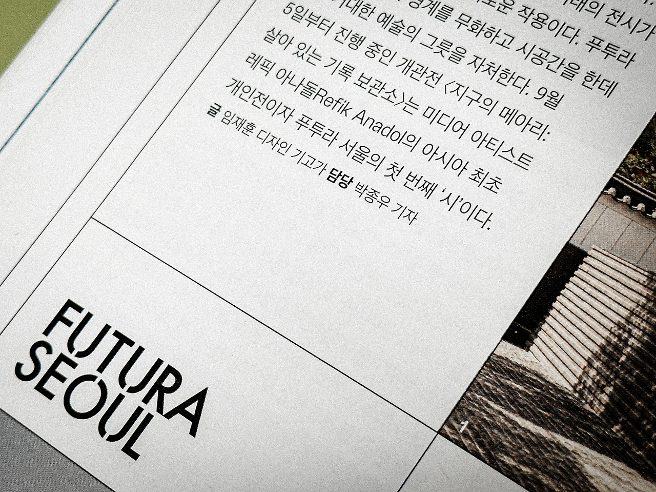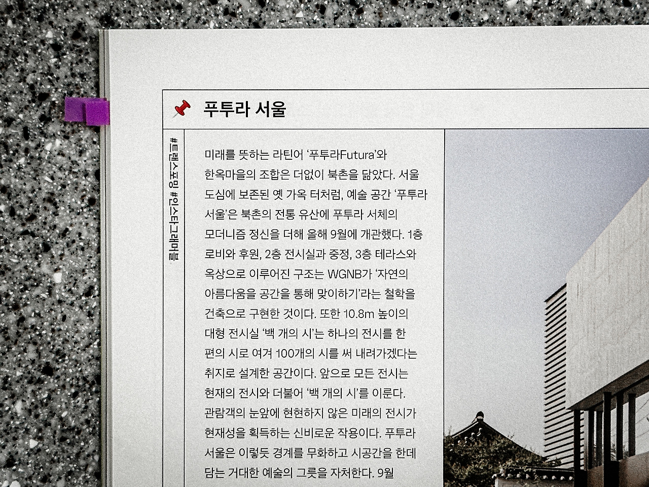 미래를 뜻하는 라틴어 ‘푸투라’와 한옥마을의 조합은 더없이 북촌을 닮았다. 서울 도심에 보존된 옛 가옥들의 터처럼, 예술 공간 푸투라 서울은 북촌의 전통 유산과 푸투라 서체의 모더니즘 정신을 껴안으며 올해 9월 개관했다.
