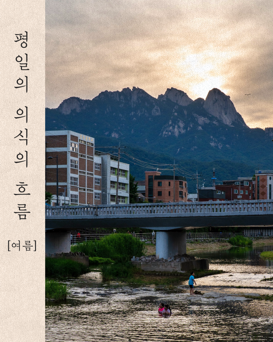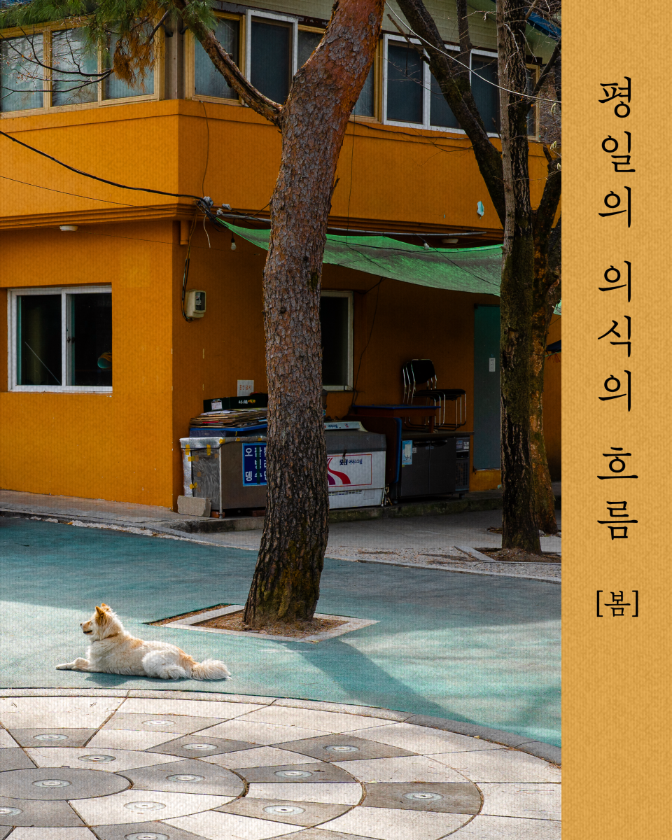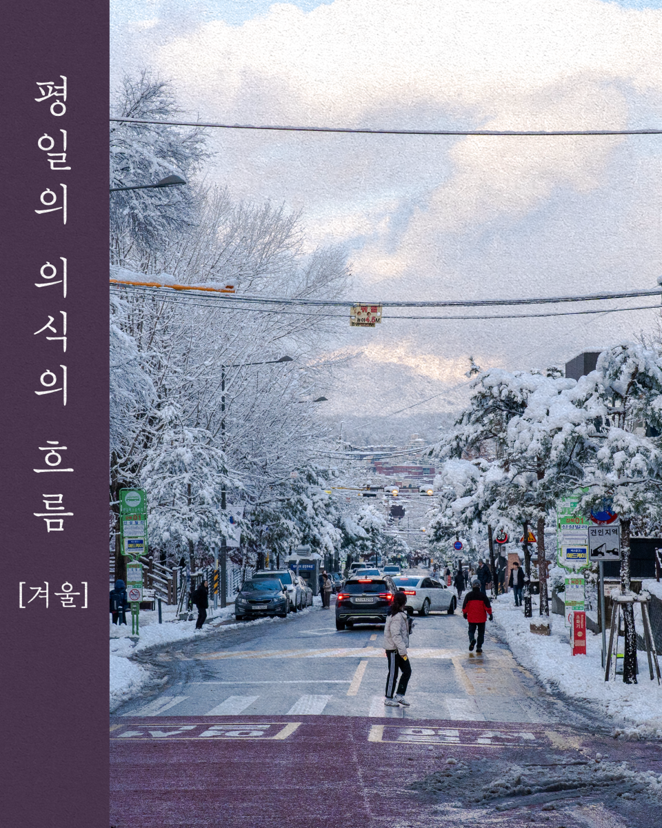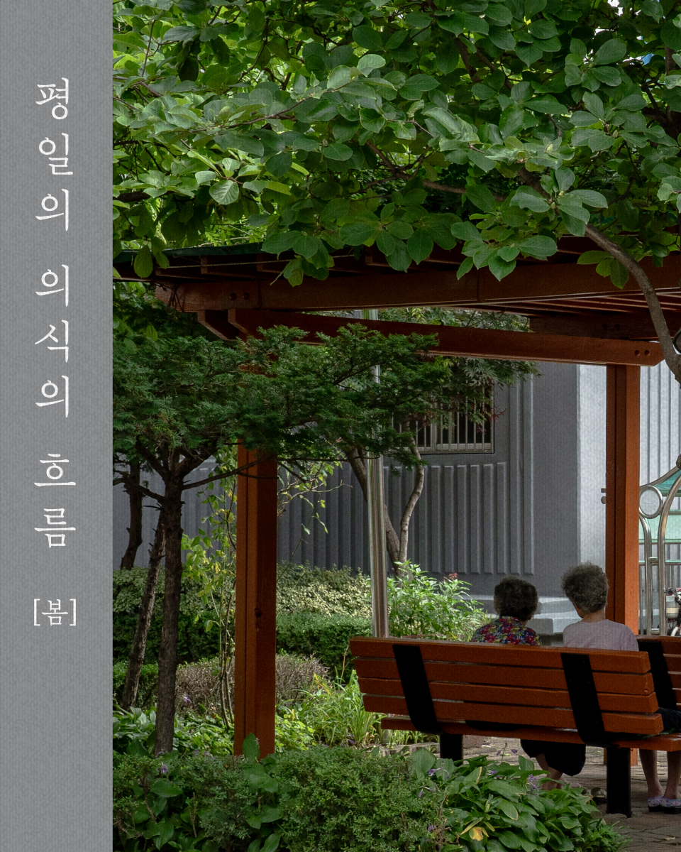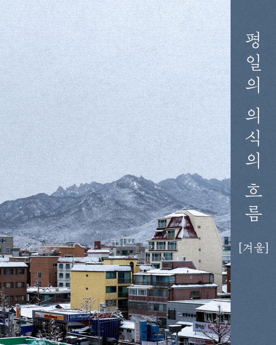 『평일의 의식의 흐름』 브런치북은 [봄], [여름], [가을], [겨울] 네 편으로 분재됩니다. 각 계절당 25편의 글과 그보다 많은 사진들을 실을 계획입니다.