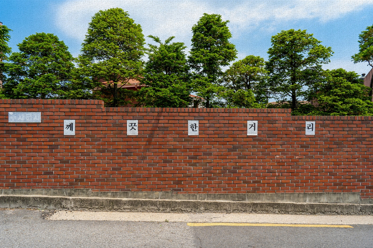 지자체 이름이 명기된 공공 안내판이 바닥에 세워진 게 아니라, ‘깨’부터 ‘리’까지 한 글자씩 인쇄된 에이포 용지 다섯 장이 코팅 처리 되어 담벼락에 붙어 있다. 빈말이 아니라 정말로 깨끗한 거리다. 과장을 약간 보태자면 언제 어느 시간대에 가도 이곳은 다른 거리들보다 눈에 띄게 깔끔하다. 인근 행정 구역들 중 유독 이 구간만 공중도덕의 가호를 입고 영원불변의 청결미를 부여받았을 리는 만무하다. 환경직 공무원들의 미화 업무와는 별개로 개인 혹은 민간 단체가 특별히 돌보는 구역일 것이다.