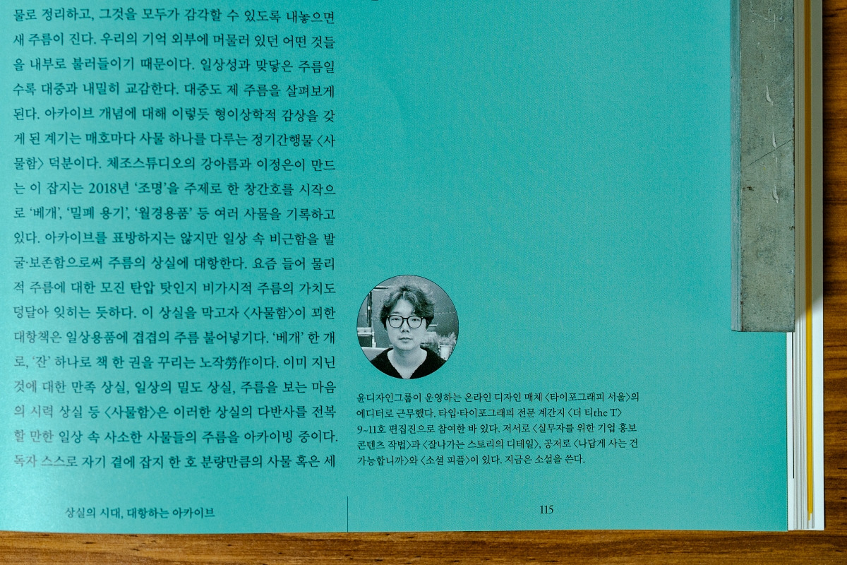 아카이브 개념에 대하여 이렇듯 형이상학적 감상을 갖게 된 계기는 『사물함』이다. 매호 사물 하나를 다루는 정기 간행물이다. 2018년 창간호 ‘조명’을 시작으로 ‘베개’, ‘밀폐 용기’, ‘월경 용품’, ‘창문’, ‘잔’, ‘편지’ 등을 기록해 오고 있다. ‘체조스튜디오’ 강아름·이정은이 만든다. 아카이브를 표방하지는 않지만 이 잡지는 아카이빙 북의 제식—주제의 일관성, 목록화·범주화된 자료 수집 체계, 기록물·편집물·대중서로서의 형질에 부합한다. 『사물함』은 비근함을 발굴·보존함으로써 주름의 상실에 대항한다. 생활인들은 링클 프리 의류, 안티 링클 화장품과 공존한다. 주름은 은폐와 말소의 대상으로 여겨지고는 한다. 목주름, 팔자주름, 눈가 주름 없애는 관리법이 뷰티 콘텐츠로 소비된다. 주름을 삶의 무늬라 은유할 줄 아는 여유는 희귀해졌다.