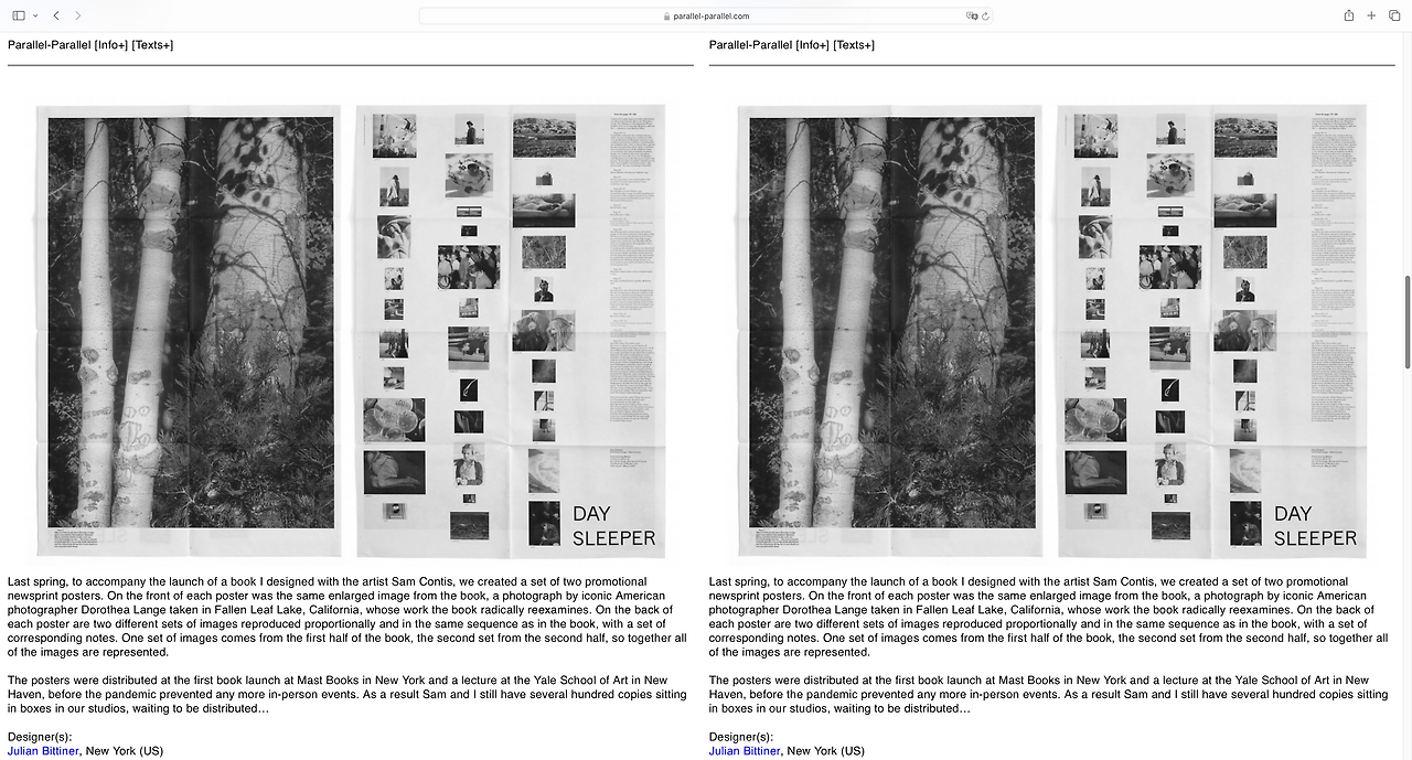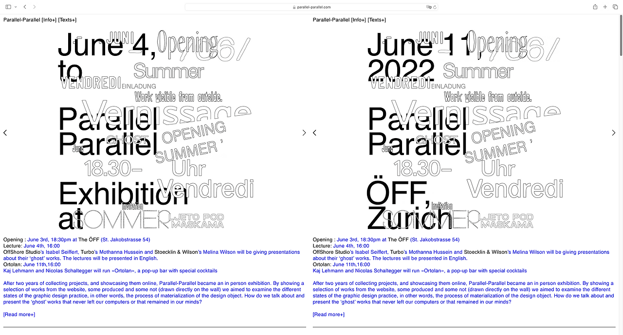 이윽고 흥미로운 온라인 아카이브가 등장했다. 이름하여 ‘패럴렐 패럴렐(parallel-parallel.com)’. 뉴욕에서 활동하는 두 그래픽 디자이너(Dorothee Dähler, Yeliz Secerli)가 시작한 프로젝트였다. 코로나19로 무기한 연기되거나 아예 무효화된 각종 오프라인 프로그램들의 그래픽 디자인 작업물을 선별해 사이트에 게시하는 방식이었다. 팬데믹 기간 동안 자발적 혹은 비자발적으로 소거되어야 했던 전 세계 그래픽 디자이너들의 활동이 기록물로 보존되었다. ‘트라이앵글-스튜디오’ 장기성을 비롯한 국내 디자이너들의 작업도 올라가 있다. 2023년 5월 WHO는 코로나19 국제공중보건위기상황을 해제했다. 패럴렐 패럴렐은 꾸준히 업데이트 중이다. 그래픽 디자이너들의 ‘상실’을 실체적 콘텐츠로 기록·전시한다, 라는 기획은 팬데믹 이후에도 유효하다. 여전히 이러저러한 이유와 명분으로 누군가는 상실을 겪을 테니. 디자이너 한 사람이 앓는 상실이 업계 전체의 망실과 손실로 전이되지 않도록, 패럴렐 패럴렐은 디자인 아카이브를 통해 ‘지속 가능성—적어도 우리는 당신을 보고 있으니 계속 나아가시기를’이라는 면역 항체를 증식하고 있다.