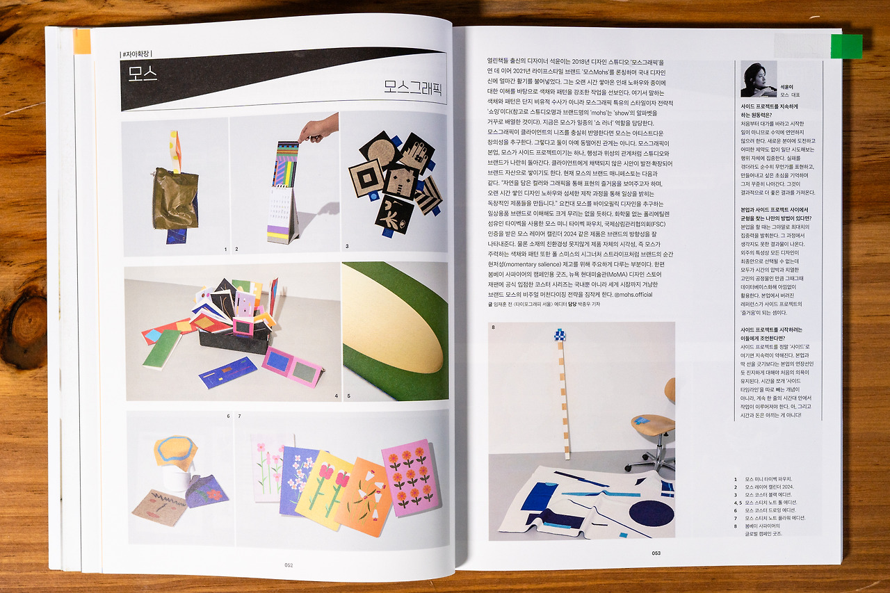 모스그래픽은 스튜디오 소개문 등을 통해 ‘오랜 시간 쌓아온 인쇄 노하우와 종이에 대한 이해’를 강조한 바 있다. 실제로 종이를 활용한 여러 작업과 상품을 선보였다. 책의 형질과 북 디자이너의 손길이 다소간 내포된 결과물이다. 구독형 텍스트 콘텐츠 플랫폼 ‘롱블랙’의 웹사이트 및 비주얼 작업을 기점으로 모스그래픽은 다방면의 영역을 아우르는 디자인 스튜디오로서 존재감을 확고히 다졌다. 종이의 재질 위로 독자적인 색채와 패턴이 새로 놓인 셈이다.