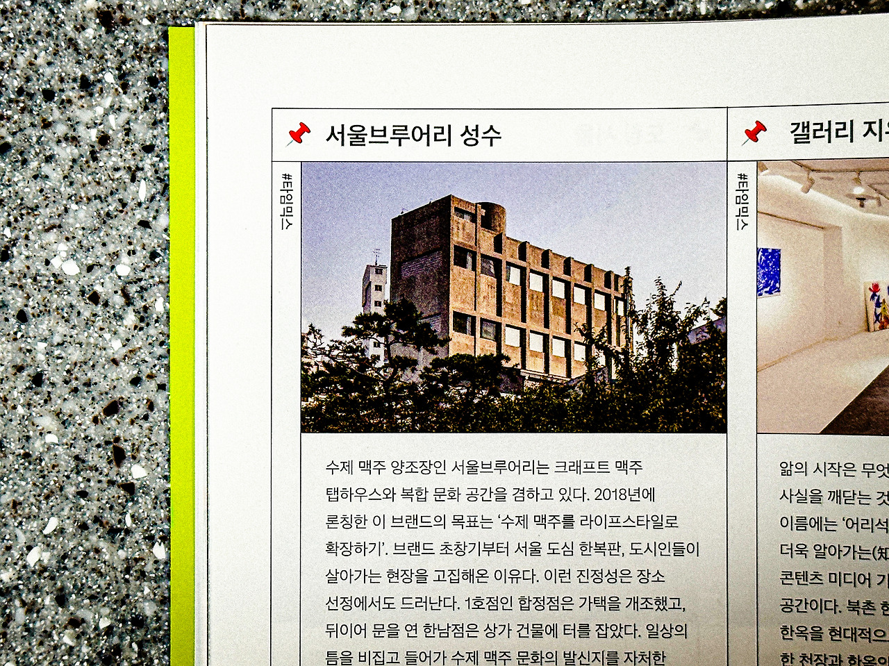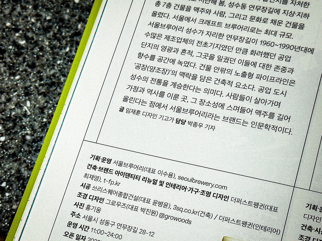 서울브루어리 성수가 자리한 연무장길은 1960~1990년대 수많은 제조 업체들의 전초 기지였다. 화려했던 공업 단지의 영광과 흔적, 그곳을 일궜던 이들에 대한 존중과 향수를 공간에 녹였다. 건물 안팎의 노출형 파이프라인은 ‘공장(양조장)’의 맥락을 담은 건축적 요소다. 공업 도시 성수의 전통을 계승한다는 의미다.