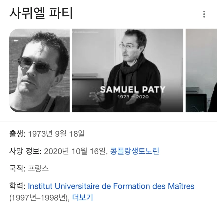 지난주 일을 마치며 나오던 중학교 교문 앞 화면에 사뮈엘 파티와 도미닉 베르나흐가 사진과 태어난 년도와 죽은년도가 적혀있었다. 짧은 생애이기에 찾아보았더니 그 일이 일어난 날인것이다.