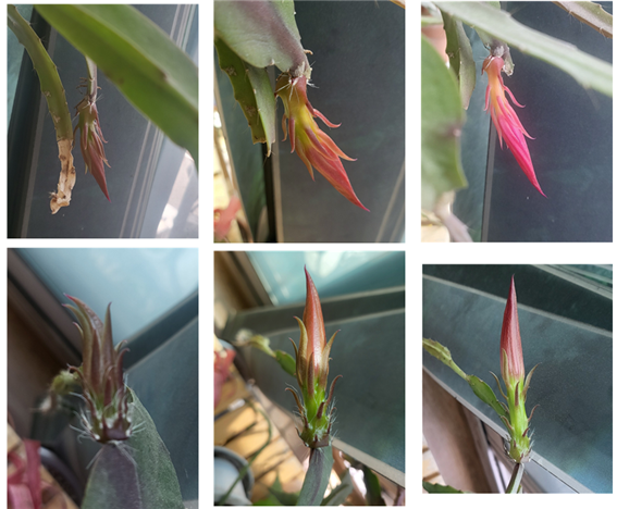 며칠 후 다시 보니, 제법 자랐다. 푸르스름한 꽃자루와 발그레한 꽃잎 부분이 확연히 구분이 되며 제법 꽃대 모양을 갖추었다. 그러다가 잠깐 아팠다. 주인도 사람인지라 갖가지 병치레를 다 한다. 코로나로 며칠 누워 있다가 다시 보니 웬걸, 그렇게 먼저 피고 일찍 개화를 할 것 같던 첫째 녀석이 푸르게 성장하던 잎자루가 힘이 없다. 불그스레한 꽃잎처럼 얇아지고 제 빛깔을 잃고 있지 않은가.