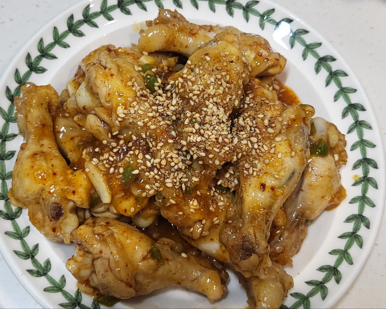 닭은 쌀뜨물에 잠깐 담가 두어서 잡내를 없앤다. 헹군 후 간장 한 스푼을 끼얹고 닭고기가 잠길 정도로 물을 부어서 삶는다. 조금 센불에서 10분 정도 삶고 살짝 익히는 게 좋다. 간도 배이고 기름기와 잡내도 없애는 과정이다. 한소끔 끓인 후 찬물에 깨끗이 헹군 다음 거기에 다시 간장과 생강즙, 올리고당을 넣고 조린다. 간이 배였을 때 다진 마늘과 청양고추, 고춧가루를 넣고 섞는다. 육수가 묽으면 감자전분을 한 숟가락 살살 뿌리고 뒤적인다. 1~2분 후 참기름과 깨소금을 넣고 마무리한다.