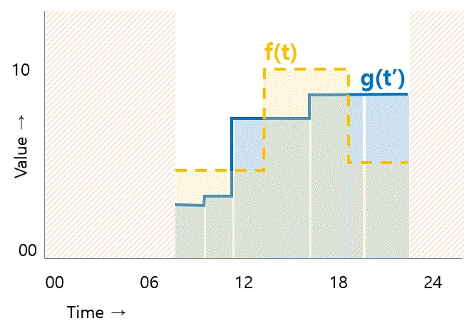 어제 나의 시간을 t, 오늘 나의 시간을 t’라고 하고 어제 특정 시점에 내가 얻은 가치를 f(t)라고 하고 오늘의 가치 함수를 g(t’)라고 하자 이걸 아래 그래프처럼 하루 시간에 대해 적분하면 하루치의 가치가 나온다. (적분은 그래프의 선 아래쪽 면적이라고 생각하면 된다.) 또 이걸 일주일 일 년 십 년 치를 계산할 수도 있다. 어제 난 가치 있게 하루를 보냈는가를 어떤 기준점을 가지고 수치적으로 계산할 수 있게 된다는 것이다