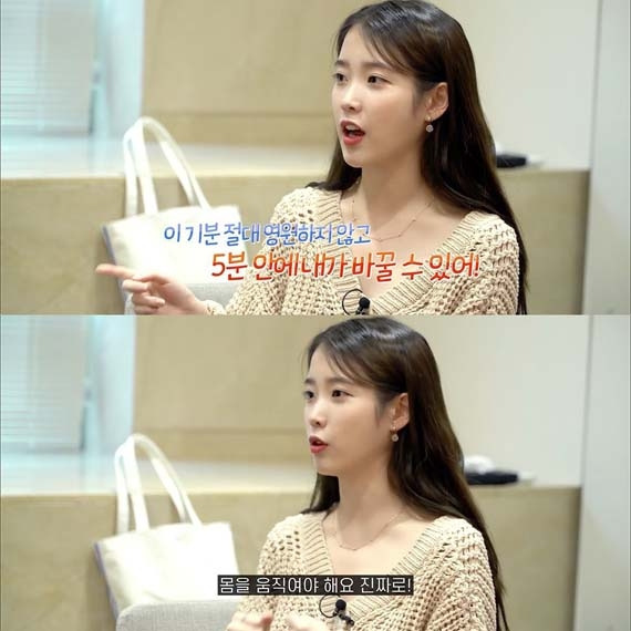 아이유: 그럴 때는 빨리 몸을 움직여야 해요. 집 안에라도 돌아다니고, 설거지라도 한다든지, 안 뜯었던 소포를 뜯는다든지. 우울한 기분이 들 때 그 기분에 속지 않으려고 노력해요. ‘이 기분 절대 영원하지 않고 5분 안에 내가 바꿀 수 있어!’라는 생각으로 몸을 움직여야 해요 진짜로!