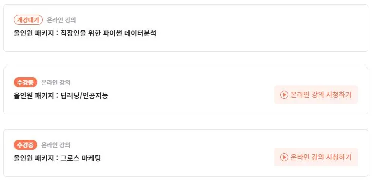 그리고 기왕 이렇게 갇혀있는 김에 업무 효율도 높이고 머신러닝 공부도 꾸준히 해보려고 패캠강의를 세 개나 샀다..ㅋ 패캠 온라인 강의는 별로라는 평을 하도 많이 봐서 살까 말까 고민했는데 지금 할인도 하고 캐시백 이벤트를 하길래 그로스마케팅, 파이썬 업무 자동화, 머신러닝 패키지 세 개나 급 질렀다...(마케팅의 노예) 원래는 매주 금요일마다 UCL 가서 머신러닝 스터디 하는게 한 주의 루틴이었는데 스터디를 못하게 되니 혼자서는 아예 손을 놔버려서ㅠㅠ이렇게라도 강제로 스스로 공부하게 만들어야 어떻게든 감을 잃지 않을 것 같다.