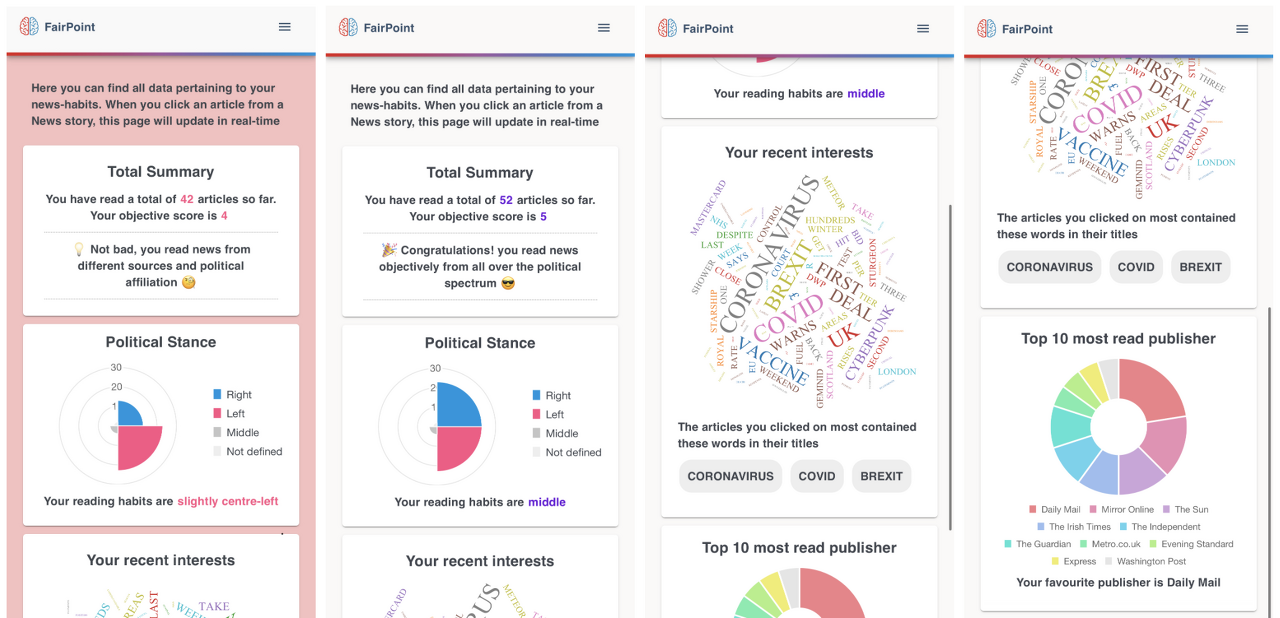 그리고 유저가 기사를 10개 이상 클릭한 이후부터는 Analytics 페이지에서 현재 기사 소비 습관을 분석해서 현재까지 어느 언론사를 통해 몇 개의 기사를 읽었는지, 뉴스 소비패턴이 어느 정치적 견해 쪽으로 치우치고 있지는 않은지, 읽은 기사들의 주제들은 무엇이었는지를 대시보드를 통해 보여준다. 대시보드 내의 차트들은 실시간으로 유저들의 클릭수를 반영해서 업데이트되고, 소비습관에 따라 다른 메시지를 렌더링한다.