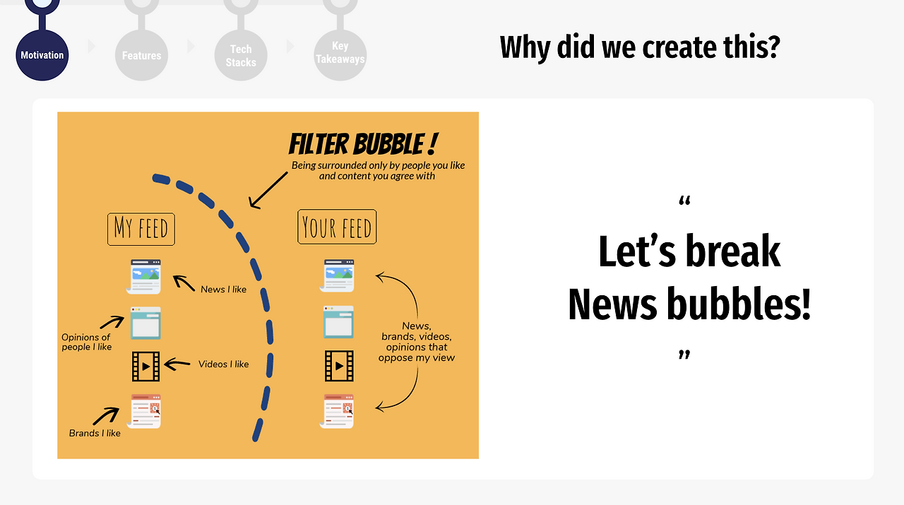 우리 팀 멤버들이 가장 크게 공감했던 문제는 대형 플랫폼사의 알고리즘에 의해 사람들은 뉴스를 보더라도 본인이 좋아하는 뉴스만 보게 되어 결국 필터 버블 안에 갇혀버린다는 것이었다. 보고 싶은 것만 보고 믿고 싶은 것만 믿게 되는 확증편향 때문에 결국 사람들이 더 이상 생산적인 토론은 하지 않고 다른 견해를 가진 사람들을 비난하고만 있는 상황을 개선해보고 싶었다.