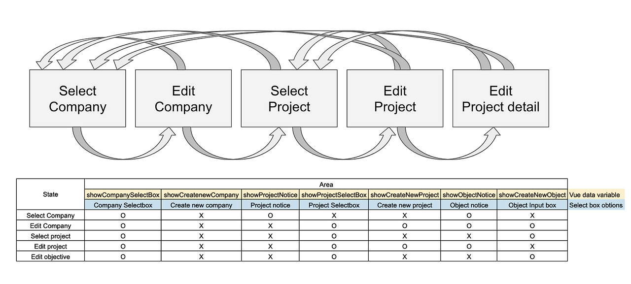 나에게 할당된 프로젝트 범위가 갑자기 늘어나게 되면서 프로젝트 관리 페이지들도 만들어야 했다. 디자이너가 요구한 구현 사항은 유저가 데이터베이스에 저장해둔 프로젝트 정보를 불러옴과 동시에 같은 셀렉트 박스 선택 옵션에 따라 수정 모드로 변환되는 페이지를 만들어주길 원했다. 한 페이지에서 아예 프로젝트를 생성할 수 있도록만 만들거나 수정할 수 있게만 만들면 훨씬 간단했겠지만, 두 개의 모드를 오가도록 페이지를 구현하는 건 정말 어려웠다. 게다가 클라이언트 이름을 선택해야만 프로젝트 셀렉트 박스를 볼 수 있고, 프로젝트를 선택해야만 프로젝트 상세 내용을 입력하는 박스를 보여달라는 렌더링 조건도 걸려있었어서 데이터를 처리하는 로직과 페이지의 뷰를 처리하는 로직이 정확하게 동기화되도록 코드를 구조화하는 게 너무 어려웠다. 이에 덧붙여서 유저의 로그인 정보는 vuex store에 따로 저장해서 전역적으로 접근할 수 있도록 만들어두었는데, 파이어베이스 데이터베이스와 vuex의 상태까지 정확하게 동기화시켜줘야 하는 대환장파티를 겪어야만 했다....처음에 내가 짰던 코드는 내가 생각했던 몇가지의 유저 흐름에 따라 콜백함수를 호출하는 방식으로 짜여진 좋게 말하면 절차지향적(사실 스파게티)인 코드였는데 유저 흐름이 내가 예측할 수 없을 만큼 다양하게 발생할 수 있는 시나리오다보니 한 케이스에 맞는 코드를 만들어두면 다른 케이스에서 오류가 나는 상황이 반복됐다. 결국 이 한 페이지를 만드느라 일주일을 끙끙댔는데, 옆에서 삽질을 지켜보던 남자친구가 이건 FSM (aka Flyng spagetti Monster)패턴을 이용하면 해결할 수 있겠다며 조언해주었다. 어플리케이션에서 렌더링해야 하는 모든 가능한 조건의 상태들을 스위치문으로 규정해두고, 선택된 셀렉트박스 옵션이 변경될 때마다 어떤 상태로 이행되어야 하는지를 정의하는 함수를 분리하여 작성해 셀렉트박스 옵션 변경 시에 발생하는 이벤트에 바인딩해주는 방법으로 코드를 아예 새로 짰는데, 훨씬 이해하기 쉬운 코드로 리팩토링할 수 있었다. 그리고 리팩토링하면서 깨달은 건데, 지금까지 내가 짜는 코드들은 한 콜백함수 안에서 모든 데이터 처리 사항들을 때려넣는 매우 지저분한 코드라는 것이었다.. 최대한 한 함수 안에서는 하나의 로직만 처리할 수 있도록 함수를 분리하는 게 좋은 것 같다. 이 난리를 한번 겪고 나니 복잡한 문제들을 논리적으로 정의할 수 있는 코드 패턴을 더 공부하고, 좀 더 확장성을 고려한 코드를 짜기 위한 고민들을 해야겠다는 생각을 했다.