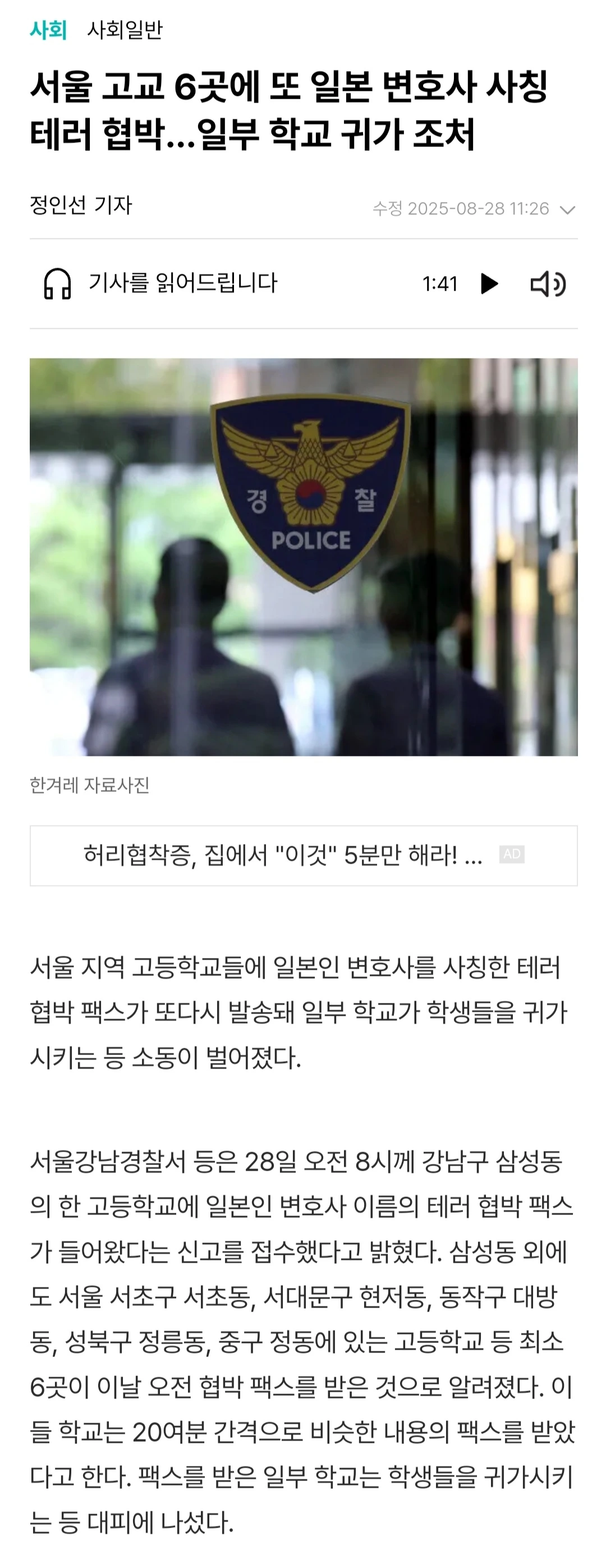 오늘, 딸아이가 다니는 학교에 폭탄테러 협박이 있었다. 믿기 어려운 일이지만, 그 소식을 접하는 순간 심장이 철렁 내려앉았다. 평범한 수업 시간에 아이들이 갑작스레 집으로 돌아와야 했고, 교사와 학부모는 불안과 두려움 속에서 서로의 안부를 확인해야 했다. 다행히 실질적인 피해는 없었지만, 협박 그 자체만으로도 충분히 심각한 상처가 된다. 학교라는 공간은 안전해야 하는데, 누군가의 혐오와 증오가 그 울타리를 위협하고 있다는 사실이 부모로서 너무나 무겁게 다가왔다.