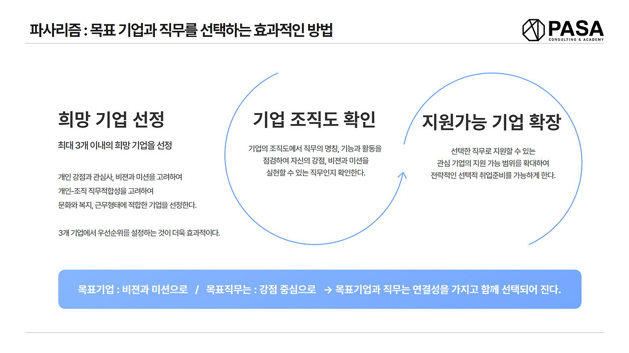 기업을 설정하면 직무를 설명하는 방법은 매우 수월해진다. 대부분은 직무를 선정하고 기업을 결정하도록 가이드를 하지만 나는 반대로 기업을 결정하고 직무를 선정하도록 가이드를 한다. 그리고 직무를 선정하면 그 직무를 통해 확장되는 기업의 리스트를 다시 설정하도록 한다.