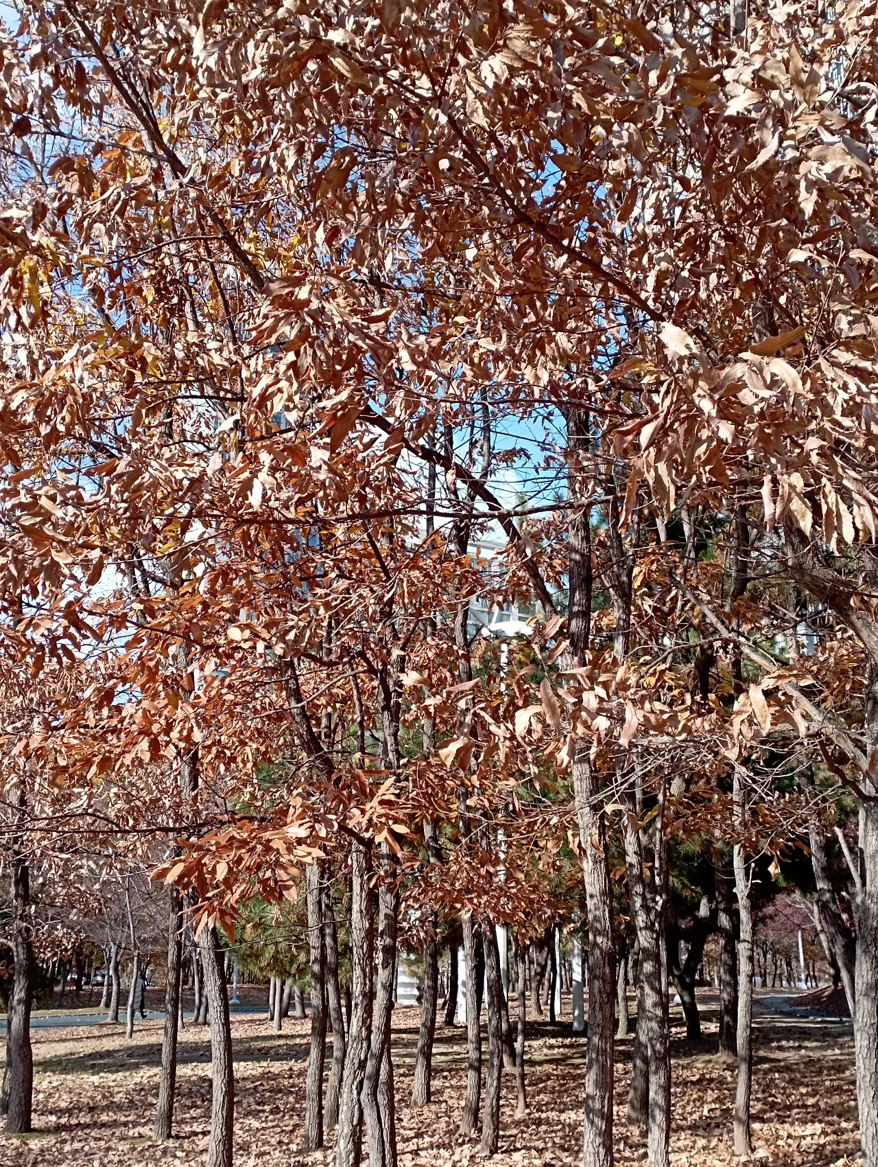 낮아지는 기온과 찬 바람에 서서히 잎이 말라도 좀처럼 떨어질 줄을 모른다.