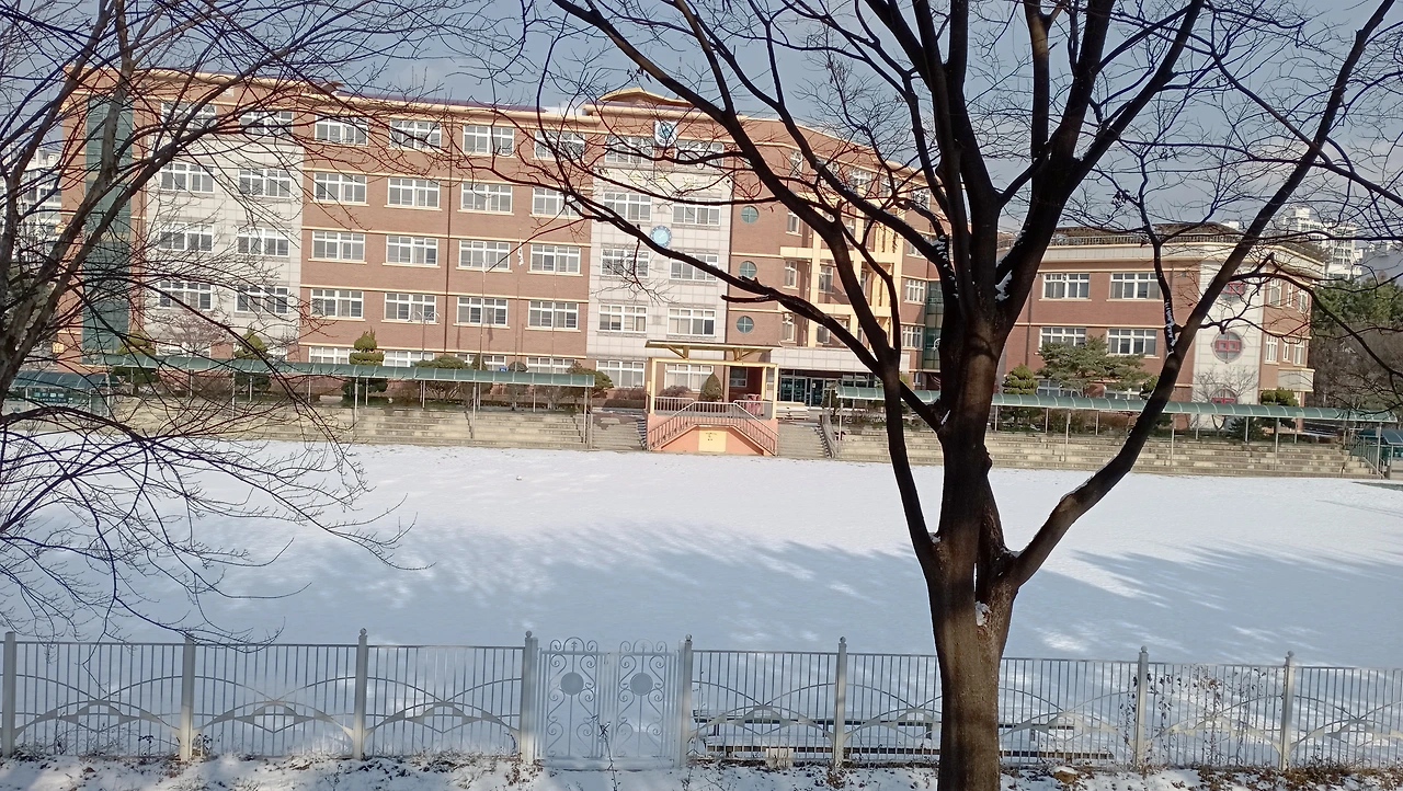 산책하는 중입니다. 초등학교 앞을 지나는데 갑자기 눈이 내리는 듯하더니만 진눈깨비로 다시 비로 돌변했습니다. 거세지는 빗줄기를 피해 건물 옆 그늘막으로 뛰어들었습니다.