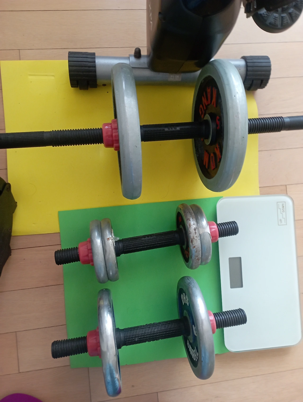 지켜보던 아내가 힘을 북돋아 줍니다. 아내가 아령을 들었습니다.