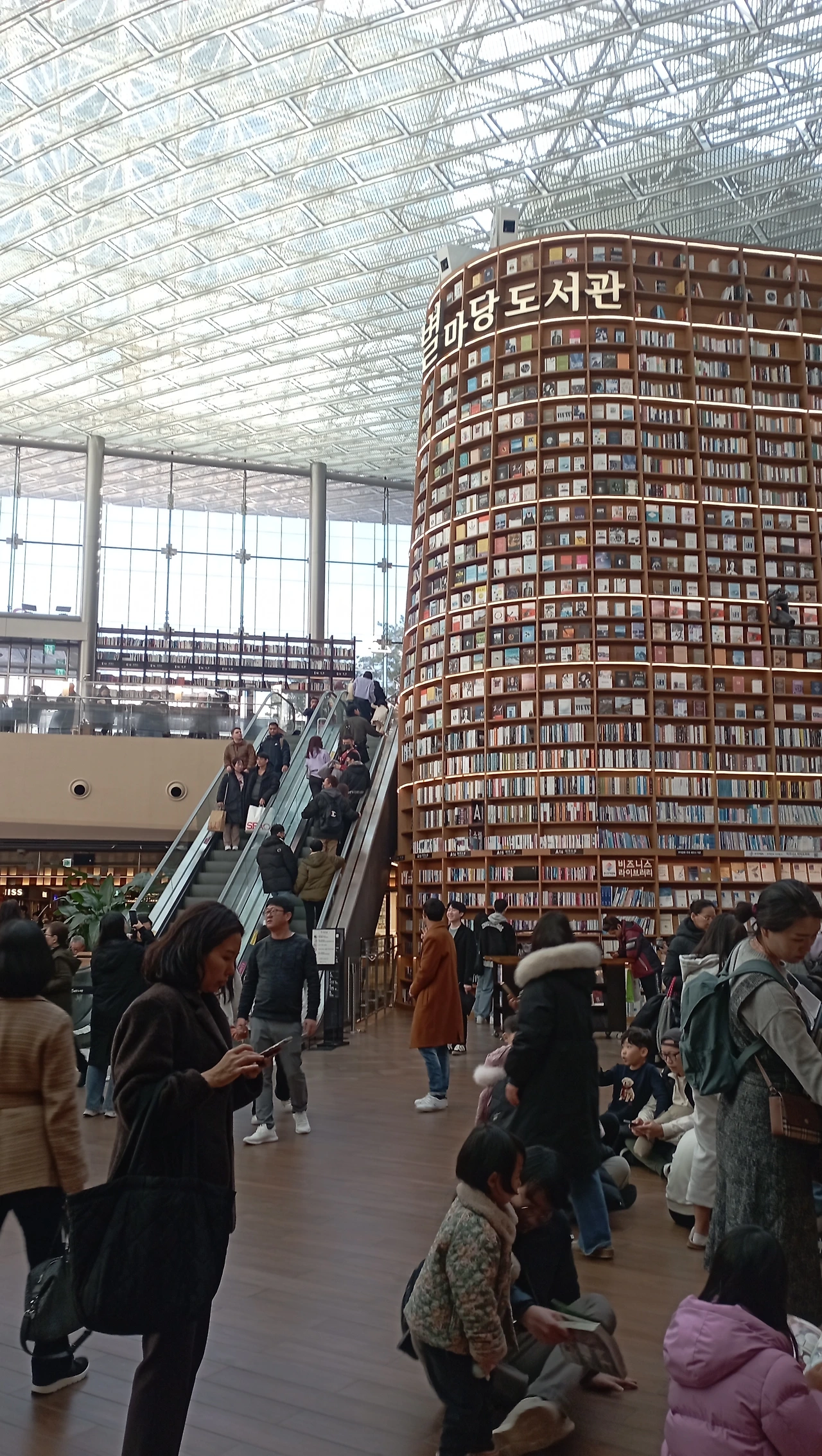 아들은 내가 책을 좋아한다는 이유로 근처에 있는 별마당 도서관으로 안내했는데 그 규모에 놀랐습니다. 센트럴 플라자 중심에 총 2천8백㎡로 복층 구조입니다. 13m 높이 서가의 은은한 불빛이 공간 전체를 부드럽게 감쌉니다. 서재를 중심으로 다양한 테이블과 노트북 작업이 가능한 자리도 있습니다. 특히 1층은 지하 1층의 공간을 조망하면서 독서를 할 수 있는 독립적인 공간입니다. 이곳에는 총 5만 여권의 각종 장서가 진열되어 있습니다.