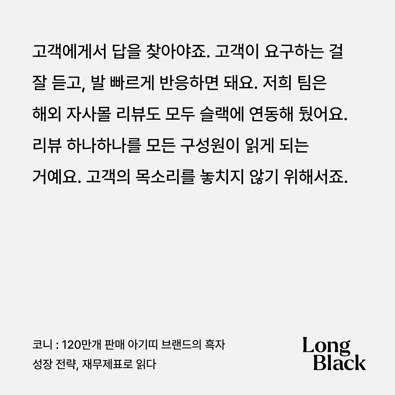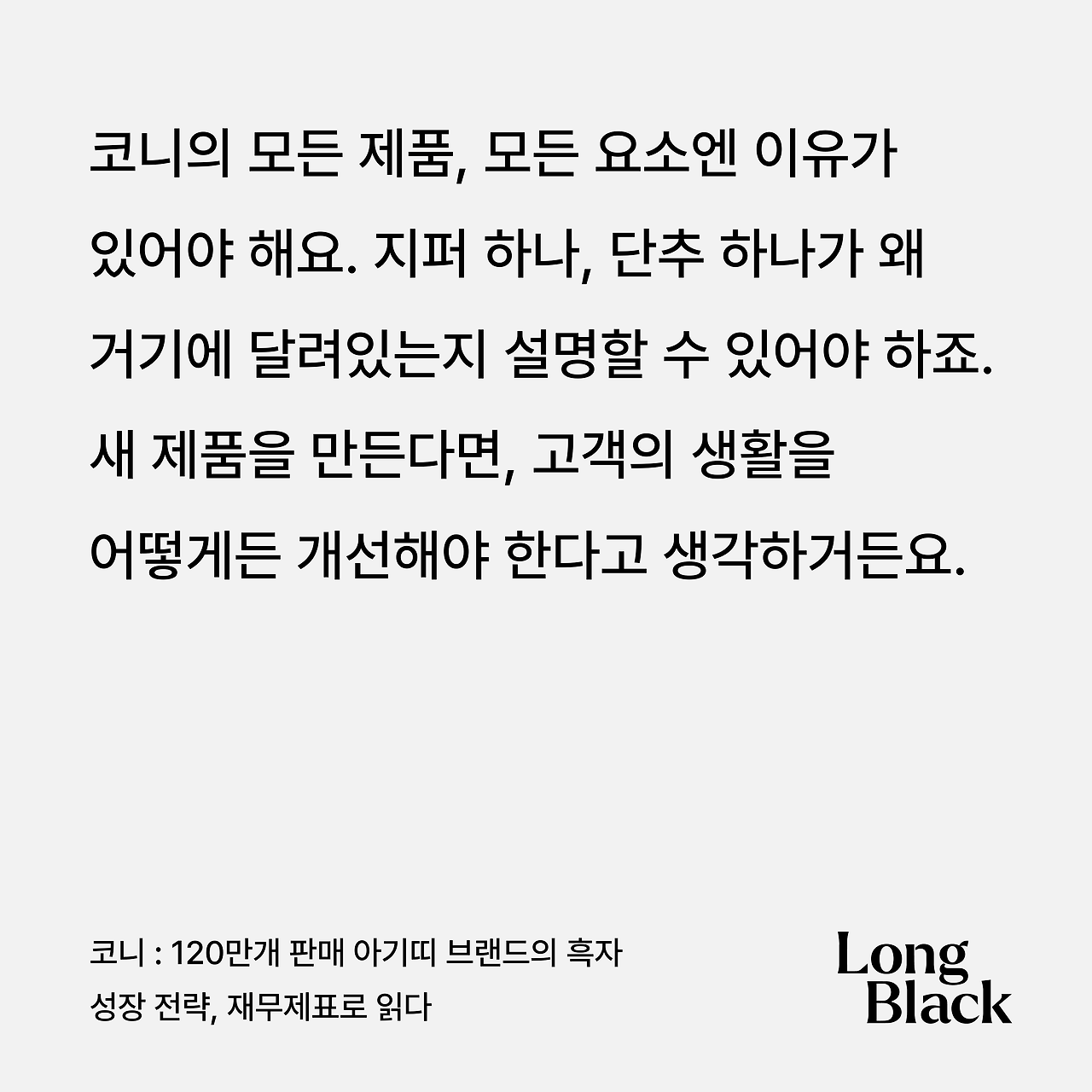 모든 고객이 제품 혹은 브랜드를 어떻게 생각하는지에 대해서 들을 수 있다면 좋겠죠. 하지만 불가능합니다. 특히 코니는 오프라인에서 판매를 하지 않고 온라인에서만 전개하기 때문이죠.