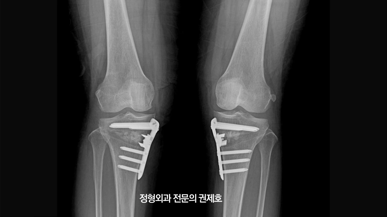 이게 바로 무릎절골술을 통해 다리의 열을 바꾸어 무릎관절염의 진행을 막으면서 동시에 무릎의 통증을 잡아주는 관절염 초기, 중기에 사용되는 수술 방법입니다.