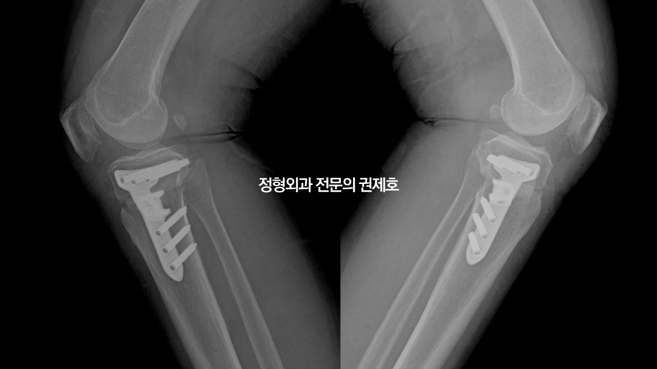 이렇게 무릎 절골술을 모두 마치게 되고 사진을 찍으면 금속판이 벌린 부분을 잡아주고 있는 모습으로 관찰되게 됩니다.