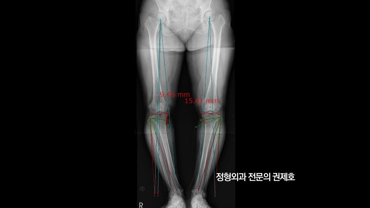 무릎 절골술을 시작하기 전에 하지정렬 검사 사진을 가지고 측정을 합니다. 얼마나 교정이 필요한지를 계산하게 되고 이것을 믿고 수술을 하는 것이기게 엄청 까다롭게 정확하게 측정하게 됩니다.
