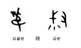 叔(숙)의 갑골문은, 나무를 타고 오르는 넝쿨콩을 그렸다. 그러므로 叔(숙)의 본의는 '콩'이다.