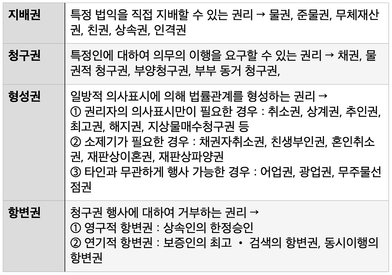 권리는 기본적으로 '효력'에 따라 권리를 구분할 수 있다. 그 종류로 ①지배권, ②청구권, ③형성권, 그리고 ④항변권 이 있다.