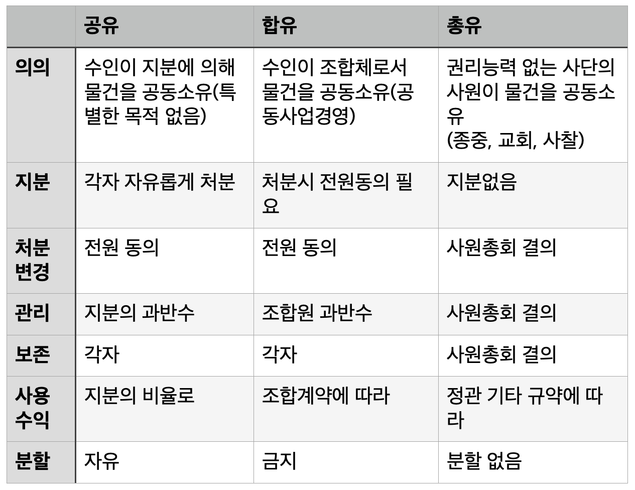 이상의 공유, 합유, 총유의 법률관계를 표로 정리하면 다음과 같다.